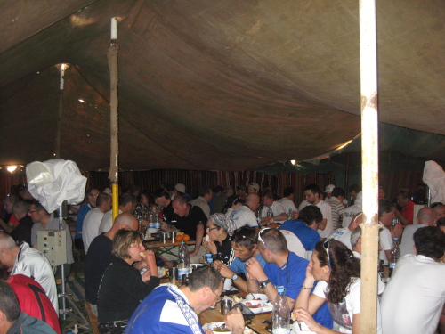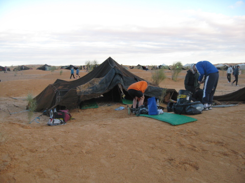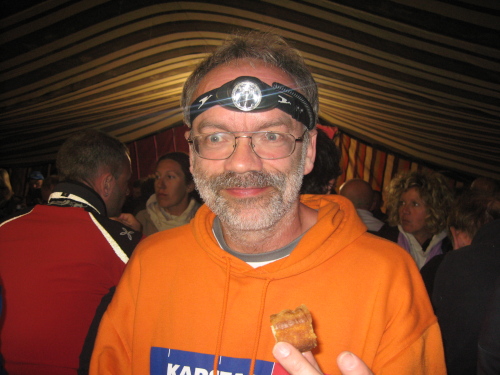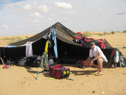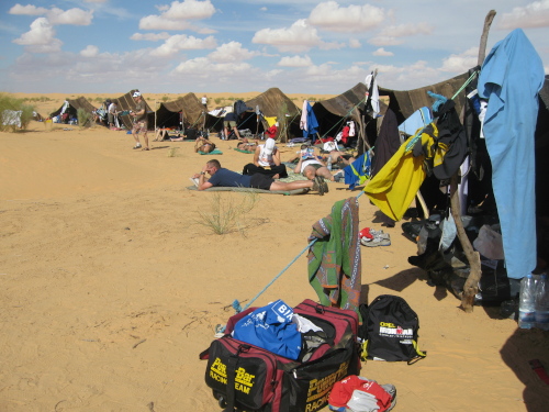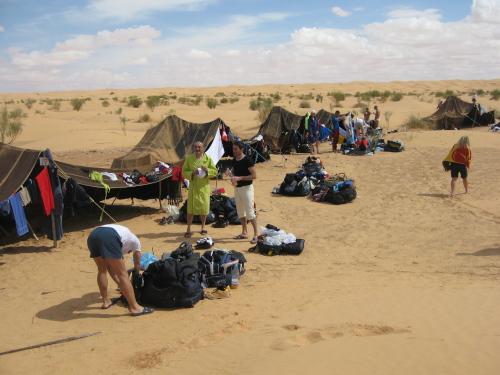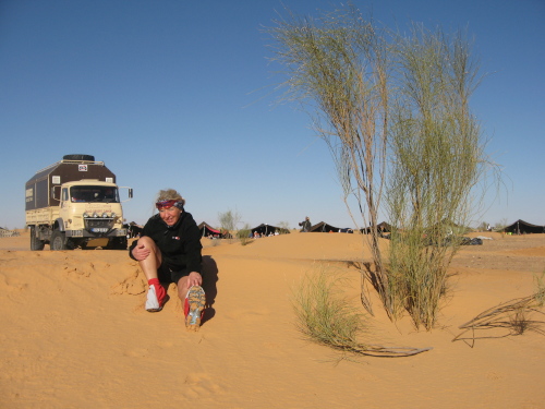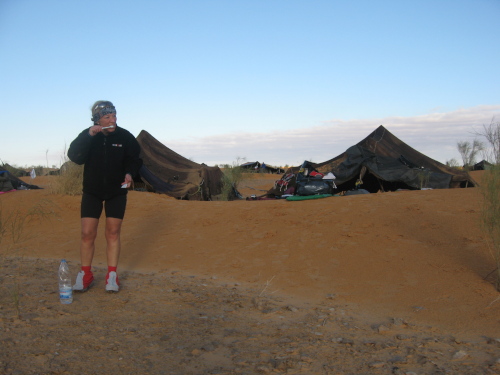 Im Ziel gab es immer frische, saftige Orangen – wie gut die nach so einem Lauf und dann noch in der Wüste schmeckten, das muss man selbst erlebt haben. Es war angenehm warm und wir wollten uns eilen, unter die „Dusche“ zu kommen. Wie verbrachten wir den Rest der Zeit? Mit fotografieren und Fußpflege. Gegen 14:00 Uhr gab es Mittagessen. Zu jeder Mahlzeit wurden Nudeln oder Reis gereicht. Wir waren müde, wollten uns aber nicht hinlegen, da wir bedenken hatten, wir könnten dann die Nacht nicht durchschlafen. Also hielten wir uns mit Gewalt wach. Wir richteten unsere Rucksäcke und Laufsachen für den morgigen Marathon – bloß nichts vergessen – sehr groß war der Respekt vor der vor uns liegenden Etappe.