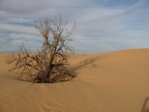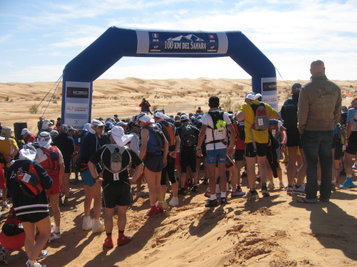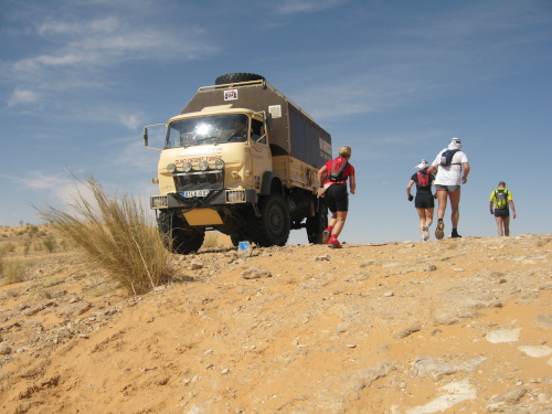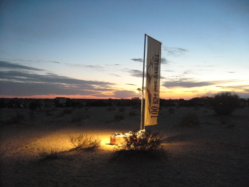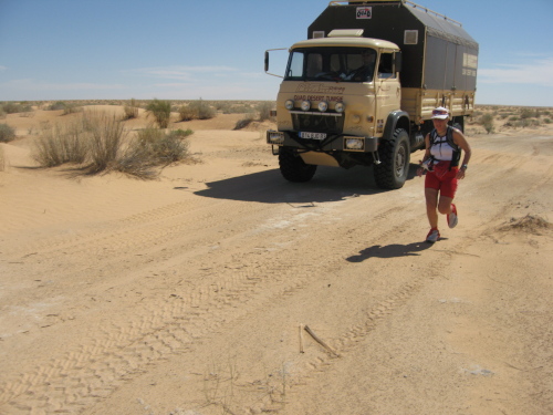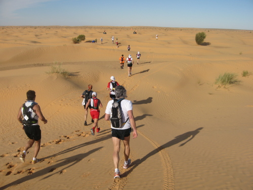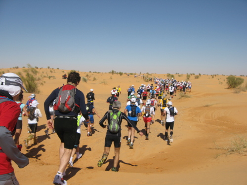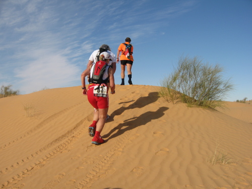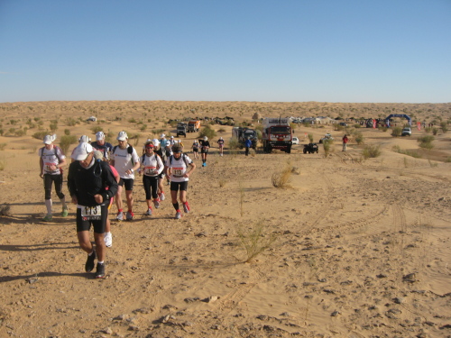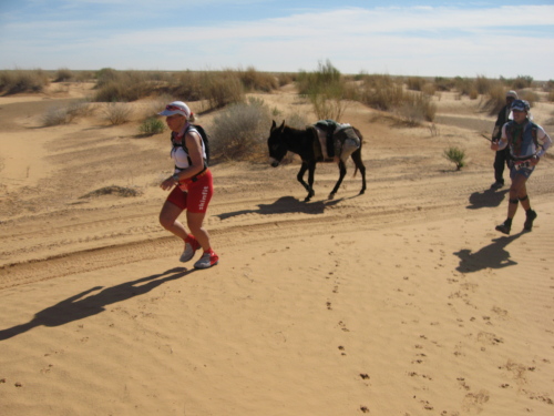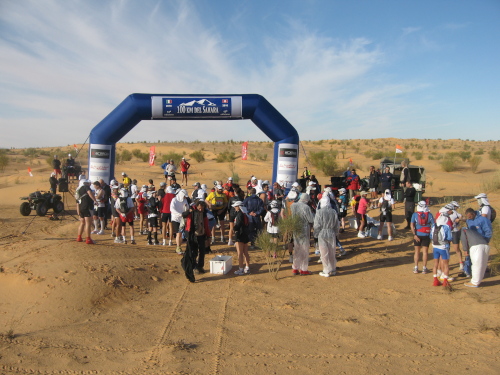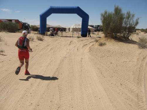 Jeder nimmt sich heute vor, es ruhig angehen zu lassen und dies als entspannende Etappe vor dem morgigen Marathon zu nutzen. 16 km, das sollte ja wohl kein Problem darstellen. Der Startschuss fällt und alles rennt los – und wir natürlich mit. Es geht gleich wieder die Dünen hoch und runter, der Sand wird mit jedem Schritt weicher. Die Füße werden heiß. An der Getränkestation laufen wir vorbei, das Wasser in den Rucksäcken reicht für diese kurze Etappe. Wir überholen die Dromedare, die unsere Walkergruppe begleitete und die Nachhut bildete, dann überholten wir die Walker. Diese waren immer gut drauf und bejubeln jeden, der an ihnen vorbeikam. Die Kilometer verflogen, wie schön, wenn man dann aus der Ferne das Lager und das aufblasbare Marathontor sah.