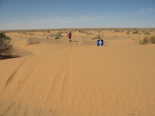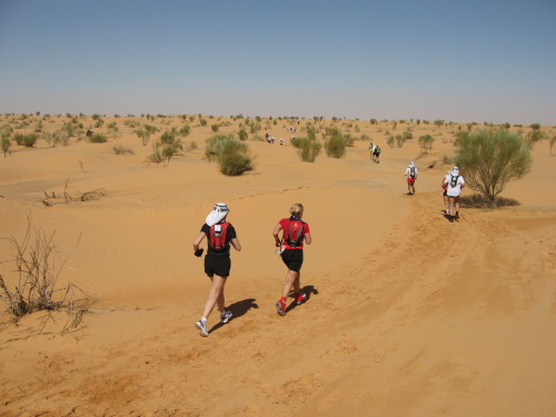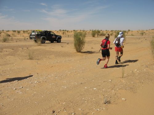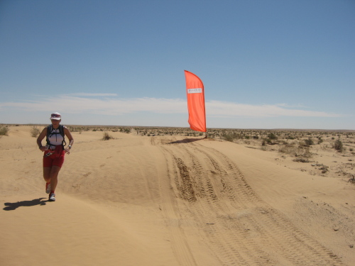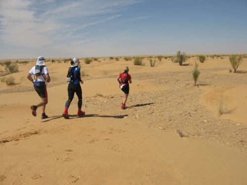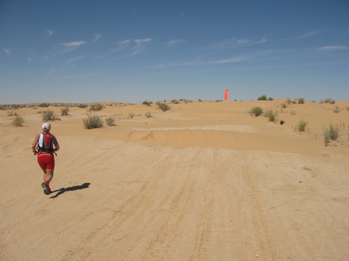Wir suchten uns den besten Untergrund zum Laufen. Die Streckenführung ließ zum Glück individuelle Vorlieben zu, wir durften nur die Markierungsfahnen nicht aus den Augen verlieren. Ständig mussten wir über Sträucher springen oder in den Dünen herum klettern. Die Füße schmerzten unter dem heißen Sand. Bergab waren die Schmerzen am schlimmsten, da meine Füße nach vorne rutschten und meine Zehen gegen die Vorderseiten der Schuhe pressten. Unsere Trailschuhe haben wir zum Glück zwei Nummern größer gekauft, denn meine Füße schwellen bei der Hitze in ungeahnte Dimensionen an.