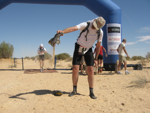 Ein weitere Herausforderung waren die immer mehr und größer werdenden Blasen an den Füssen. Diese sollten zu keiner Zeit unterschätzt werden. Wir trugen zum Glück Gamaschen über den Schuhen, um den Sand herauszuhalten; aber die Füße fingen dennoch an zu schwitzen. Kay jedoch hatte mehr Glück als ich und kam ohne eine einzige Blase durch das gesamte Rennen. Im Lager war ein Sanitätszelt aufgebaut und das Haupttagesgeschäft der Ärzte war die Behandlung von Blasen. Blasen können so schmerzhaft werden, dass sie einen zwingen, das Rennen abzubrechen. Ich wollte nicht dazugehören. Daher nahm ich mir nach jedem Rennen sehr viel Zeit für die eigene Fußpflege. Ich habe die Blasen aufstechen müssen um etwas Druck abzulassen, anschließend noch etwas Fußpuder darauf. Der Rest des Tages lief ich nur noch mit Flip-Flops durch das Lager, damit genügend Luft an die Füße kommt - egal wie kalt diese im Laufe des Abends wurden.