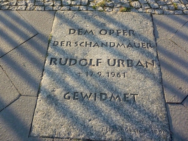 Km 10, die ehemalige Mauer bog von der Gartenstraße scharf nach links in die Bernauer Straße. Fast wöchentlich bretterten Westautos von der Gartenstraße kommend mit Höchstgeschwindigkeit gegen die Mauer. Anklagender Selbstmord.
