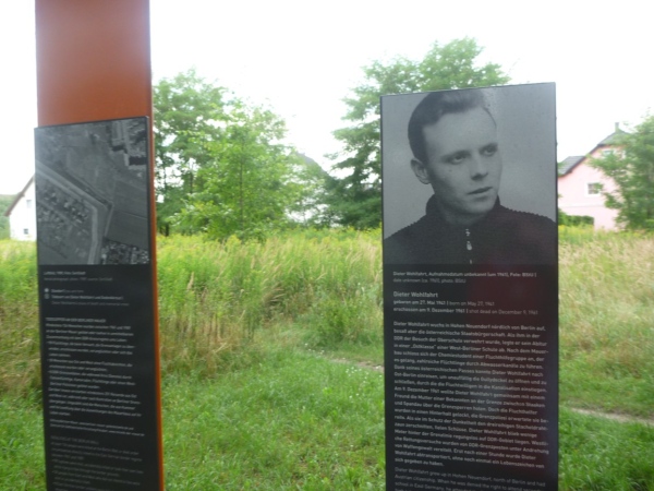 An einer Stehle das Foto eines Jungen aus Eiskeller, den ein Panzerwagen über die 800 Meter lange Straße zur Schule geleitet. Der Schulschwänzer hatte behauptet, DDR-Grenzer hätten ihn entführt, weswegen er nicht zur Schule gehen konnte.
