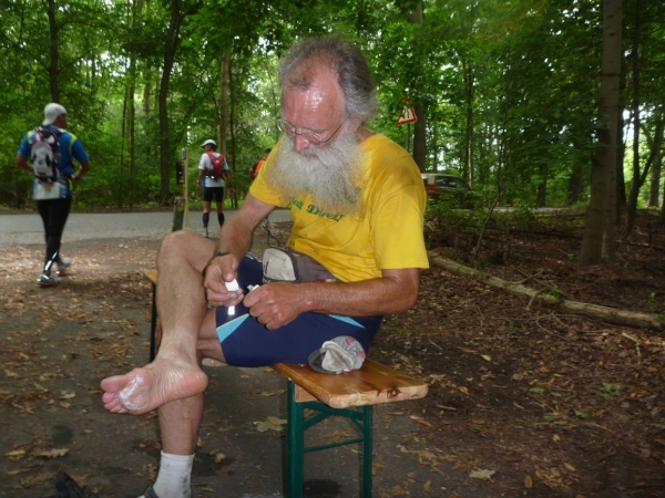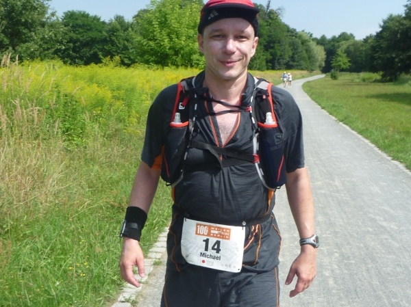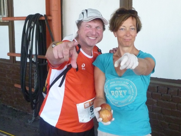 Am VP 7 (km 39) Frohnau stehen Michael Vanicek und Jan Prochaska, die beiden Gewinner der 100 Meilen-Premiere im Jahr 2011. Ich brauche Bier: “Hamm mer nich. Oh, Hey Joe, Du bist´s, geiler Bericht! Klar kriegste Bier! Die Sehne läuft sich dann wieder ein!“