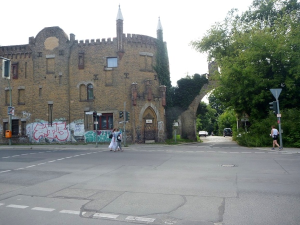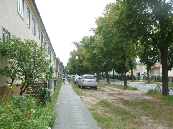 Ich muss jetzt Anja aus Dänemark ziehen lassen, denn ich kapiere nicht den Grenzverlauf, muss fragen. Rechte Straßenseite Kopfsteinpflaster und saubere, große Einfamilienhäuser mit Trampolin in den Vorgärten und Stempel des Bausparfuchses. Linke Seite dreckiger Grünstreifen mit geparkten Autos und zerbrochenen Gehwegplatten vor Kasernenhäusern. Verkehrte Welt. Wo ist Westberlin, wo ist DDR-Gebiet? Auf dem Grenzstreifen sind Prachtbauten entstanden. Die blühenden Landschaften? “Dort am Zaun des Vorgartens war die Mauer”, sagt mir ein alter Mann, der hässliche Bürgersteig ist Westberlin, die Wendeschleifen aus Kopfsteinplaster waren für die Westbusse, die hier umdrehten.