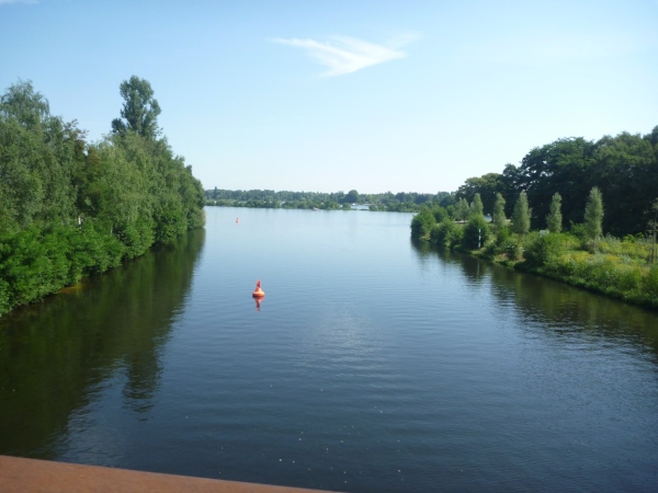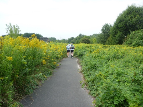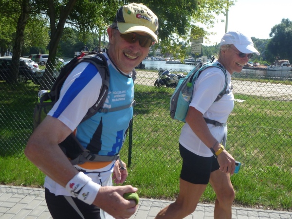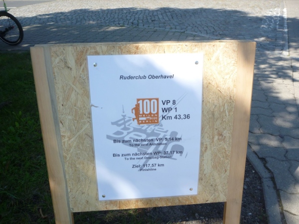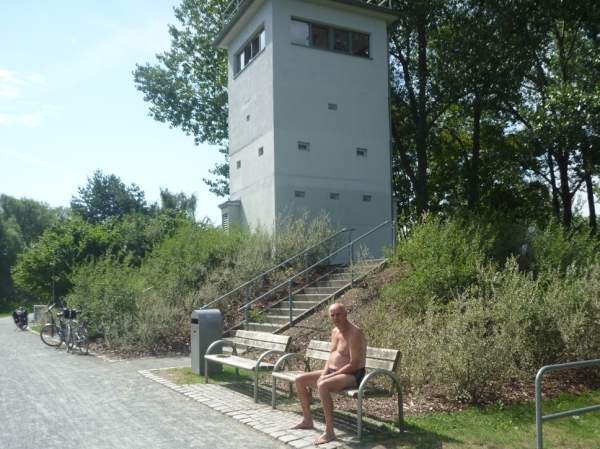 VP 9 (km 48) Grenzturm Nieder Neuendorf. “Schätzelchen machmer Foto!” sage ich zu Maria, die von HaWe begleitet wird, ohne zu ahnen, dass sie in drei Stunden im Krankenhaus sein wird. Der Weg geht entlang der Havel, die Grenze war mittendrin, biegt dann ab in den sandigen Spandauer Forst mit seinen ewig langen Wegen, wo entlang des Weges noch die Pfosten des Stacheldrahtes neben den Grenzsteinen stehen.