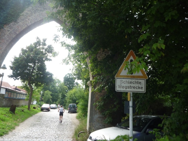 Steini zieht vorbei: “Meld dich doch in der Invalidensiedlung an!” Ja, die Invalidensiedlung (1748). Die 50 Häuser stammen von 1938: “Wohnfühlen trotz Handycap.” Handy gehört zur Pflichtausrüstung dieses Laufes und so kann ich mir über ein soziales Netzwerk noch ein kaltes Getränk für die folgenden Kilometer ordern.