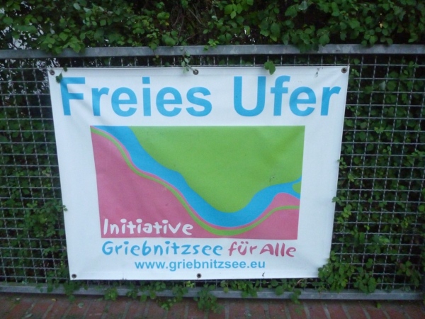 Die Potsdamer Stadtverwaltung entfernte 2010 die westliche Sperranlagen. Dennoch ist es nicht erwünscht, dass wir Läufer den Uferweg benutzen. Plakate “Freies Ufer” erzählen vom schwelenden Konflikt.