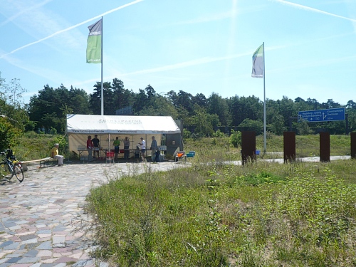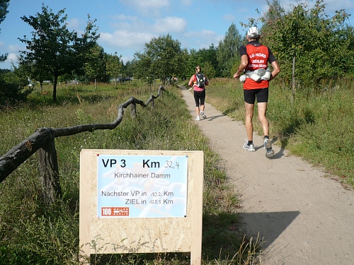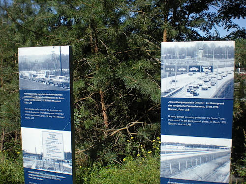 Dann folgt „Checkpoint Bravo“, er musste von den West-Alliierten auf ihrem Weg von Helmstedt (Bundesrepublik, „Checkpoint Alpha“) genutzt werden. Etwa einen Kilometer hin und einen wieder zurück laufen wir, um zum VP 6 am Checkpoint Bravo zu gelangen. Hier an der alten Autobahn war der Grenzübergang Drewitz. Die Raststätte und Reste des Kontrollpunktes sind noch erhalten. In der Nähe wurde 1965 der Westberliner Hermann Döbler (42) erschossen, als er versehentlich mit seinem Sportboot in das DDR-Grenzgewässer geriet. Er wusste nicht, dass die Grenze schon 100 Meter vor der Wassersperre beginnt.