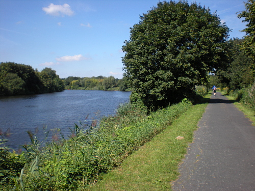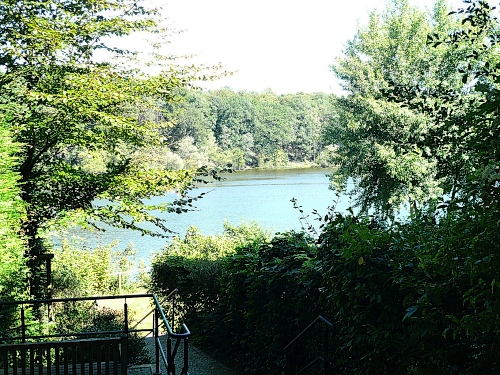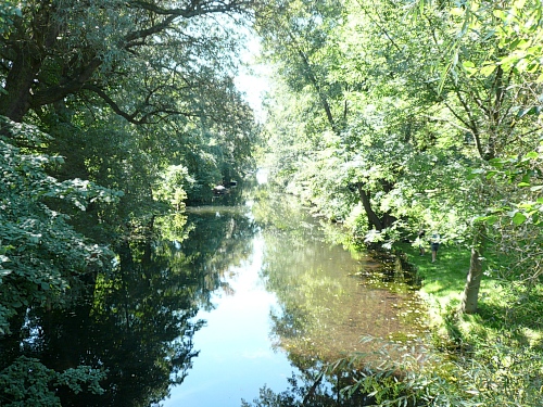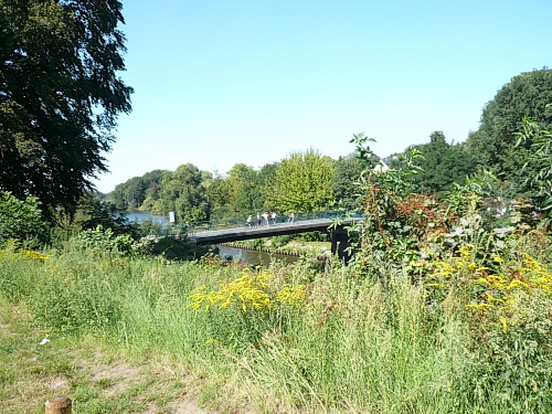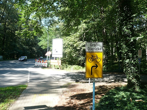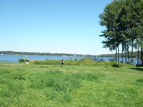 Am Teltowkanal entlang bis zur Knesebeckbrücke führt der alte Postenweg schnurgerade entlang. Rechts das Wasser, links steht noch der dichte, metallene Grenzzaun. Nun trennt der Zaun Privatgrundbesitzer von Joggern, Radlern und Wanderern.