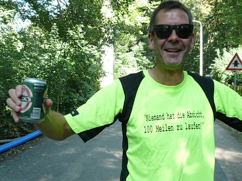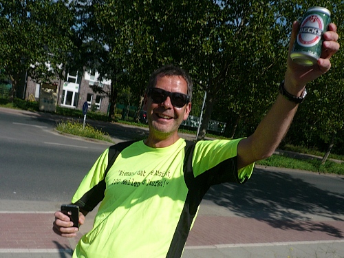 Carsten steht am Weg, hält eiskaltes Bier hoch. Mann! Vielen Dank. In Bierlaune quatsche ich einen Bewohner an. Ja, wir sind auf der Ostseite der ehemaligen Mauer. Hier vor seiner Haustür, direkt davor, war dieses Monstrum. Jede Wochen kamen “DIE“ und kontrollierten seinen Keller, ob dort gegraben wird. Besucher mussten sich eine langwierige Genehmigung einholen.“Scheiße war´s“ sagt er, „die haben meine Jugend zerstört!“