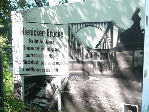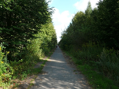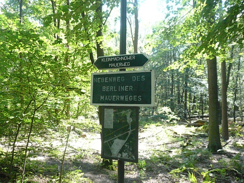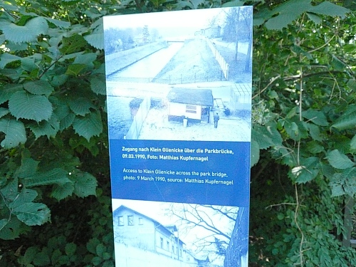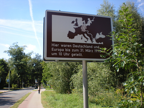 Der nächste Abschnitt des Mauerwegs gehört landschaftlich zu den schönsten und trostlosesten. Keine Grenzanlagen mehr, aber ein krasser Übergang von der Stadtkante (West-Berlin) und freiem Feld (Ostberlin), unterbrochen von dem 12 Kilometer langen geteerten Mauerweg, deutet immer noch auf die gewaltsame Teilung hin. Sehr bizarr: Ein Foto der Gropiusstadt, welches die Trennung von Ost und West verdeutlicht.