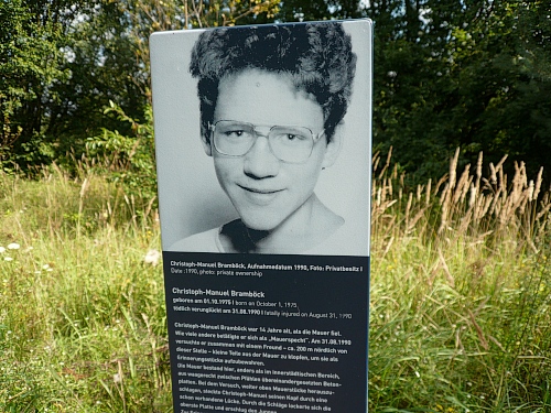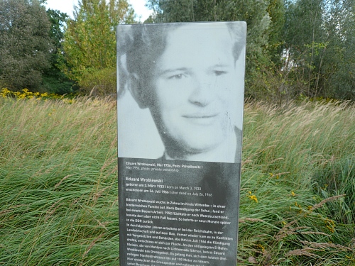 Bei km 25 Gedenkstein an die „gewaltlose Öffnung der Grenzanlagen. Gedenkkreuz für Horst Kullack (23), erschossen 1971.