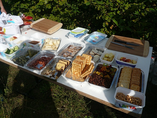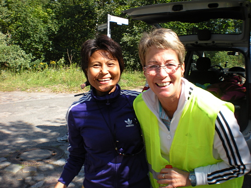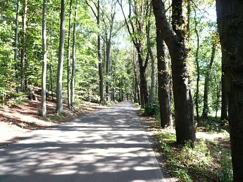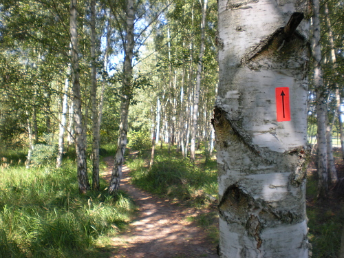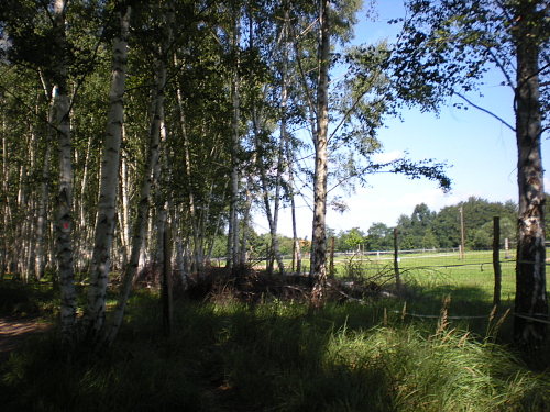 Der Grenzstreifen ist stark zugewachsen. Zwischen den Birken Pilzsucher. Auffallend die vielen Bäume der Traubenkirsche. Ich koste einige der Früchte, mir reißt es den Magen weg und dann von den Füßen. Der Mauerweg ist holprig, Nahtstellen im Asphalt und Wurzeln machen das Laufen nicht einfach.