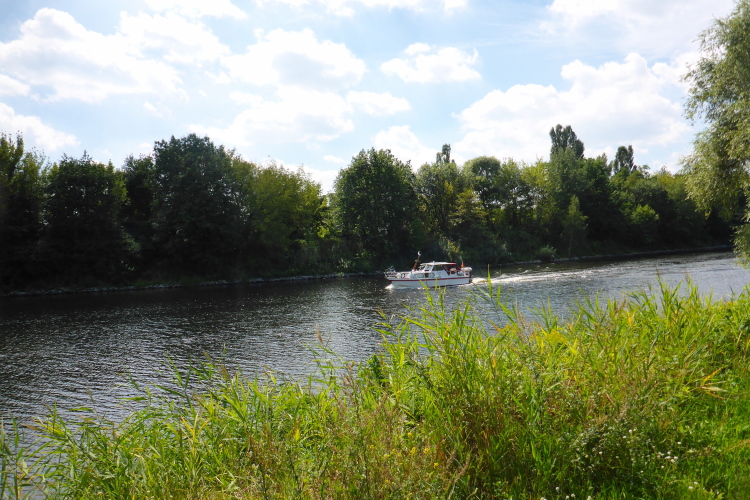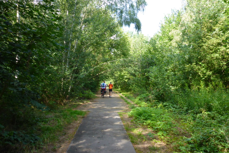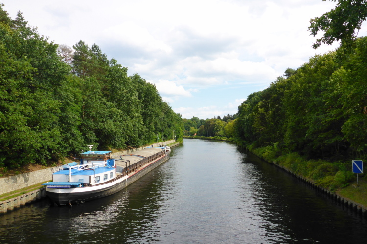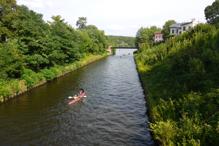 Es geht entlang des wunderschönen Griebnitzsees, den die DDR-Bürger wegen er Mauer nie gesehen haben. Bei km 75 überqueren wir wieder den Teltowkanal über die Parkbrücke, die nun in einem wunderschönen Biergarten eingebettet ist, und gelangen zu der ehemaligen DDR-Exklave Klein Glienicke, die wie ein flaches „U“ weit in Westberliner Gebiet ragt, aber von allen Seiten von der Mauer umgeben und nur über diese eine Brücke zugänglich war. Auf der Brücke standen permanet DDR-Grenzler und kontrollierten jeden Einkauf der Ost-Bürger, die über den Teltowkanal zu ihren Häusern wollten.