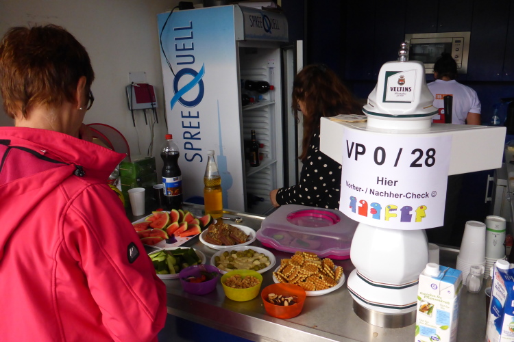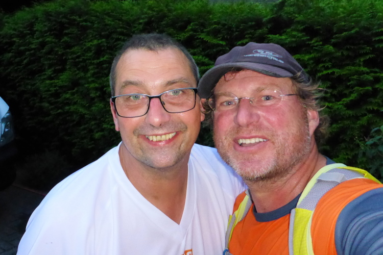 Ich bin jetzt beim Grenzturm Nieder Neuendorf (km 123), bin fit, hätte nie erwartet, so gut durchzukommen. Jetzt ist eine Bestzeit drin! Das gibt neue Kraft. Ich laufe die nächsten 5 Kilometer in guter Haltung und erreiche den Ruderclub Havel (km 128). Das Wiedersehen mit den Helfern ist lustig, 2011 war hier ne Teenieparty, wo ich mit Andreas nach dem Duschen auf der Tanzfläche die Ossies aufgemischt habe. Ganz soviel Zeit habe ich diesmal nicht, ich muss auch nicht duschen. Kurze Pause, Klamottenwechsel und weiter, ich will es jetzt wissen!