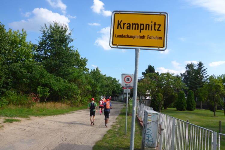 Wir kommen an der Gedenkstele Karl-Heinz Kube. Da er aus Teltow kam, steht in Teltow nochmal ein Gedenkkreuz für ihn. Klaus Garten wurde hier erschossen, Walter Kittel hatte sich ergeben und wurde trotzdem erschossen. Eigentlich müssten wir nun den Teltowerkanal nach Norden überqueren, aber es geht einen Kilometer weiter auf einem Begegnungstück, um in der Sporthalle von Teltow (km 59) zu pausieren. Es ist einer der drei Hauptverpflegungstellen mit den Dropbags. Hier kann man duschen und sich aufs Ohr legen. Am Ausgang lassen wir Luftballons mit einer Gedenkkarte an Karl-Heiz Kube in den heißen Mittagshimmel fliegen.