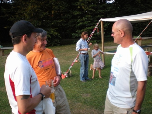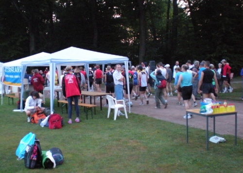 Morgens 6 Uhr ist Start.Die Verpflegung ist einmalig gut: alle 3,3 km Bananen, Pellkartoffeln, Brot, Riegel, Haferschleim, Iso, Tee, Wasser, Cola, Malzbier, Bier. Nach 1,6 km und 5 km zusätzlich Wasser und Cola, und das auf einer 10km-Runde. Obwohl die Strecke hauptsächlich im Schatten des Waldes verläuft, wird es an die 30 Grad warm werden.