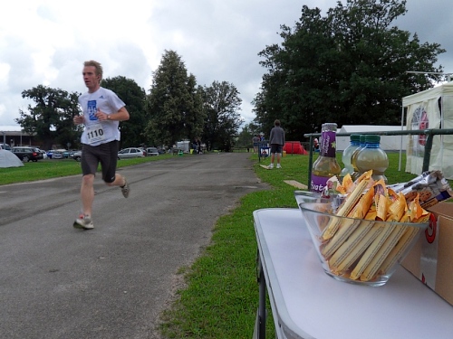 Während ich mir Gedanken über diesen Artikel mache und die ersten Bilder bis zum Start auf den Chip bringe, haben meine Teamkollegen unseren Beitrag zur Zeltstadt fertiggestellt. Dann darf ich ran. Unmittelbar nach der Rundenmessstelle befindet sich die Verpflegungsstelle und der Wechselbereich. Also der Start- und Zielbereich. Kurzer prüfender Blick zum Fuß nach der roten Papierlasche mit dem Chip, die an den Schnürsenkeln zu befestigen ist, schon kommt mein Kamerad ums Eck. Während die Ultralangstreckenläufer ganz relaxed laufen, darf ich rennen wie ein Hirsch. Das ist der Nachteil am Teamwettbewerb. Abklatschen und los geht's.