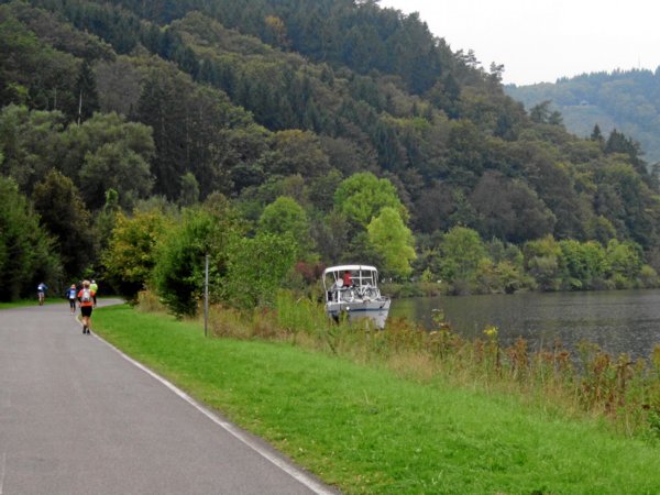 Von Mettlach aus ging es also der Saarschleife entlang. Vor knapp fünf Wochen bin ich hier den Saarschleifen Marathon gelaufen. Allerdings war ich damals flott unterwegs, nicht zu vergleichen mit meinem jetzigen Misch aus Laufen und Gehen. Zum schnellen Laufen hatte mich die bisherige Strecke viel zu sehr angestrengt und angesichts der folgenden drei Tage hielt ich mich auch bewusst zurück.