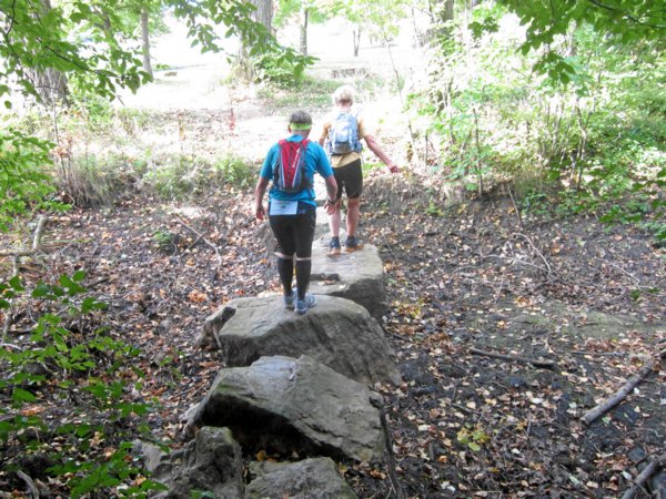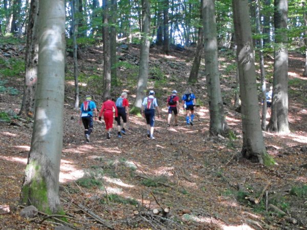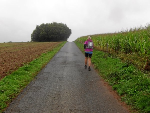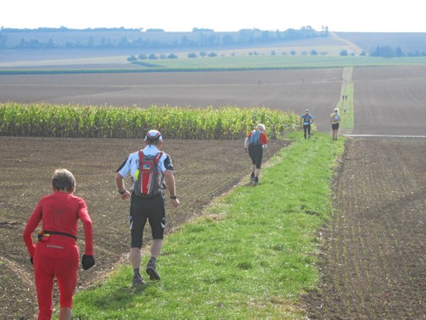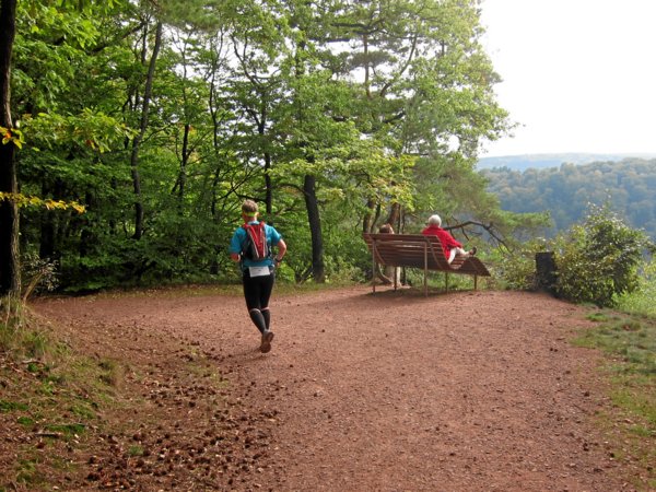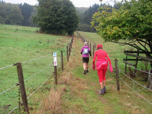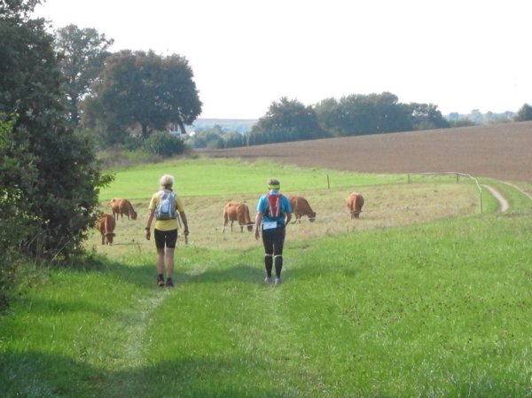 Die Strecke wasehr abwechslungsreich, man lief durch offene Landschaft, Felder, Wiesen, aber auch im Wald. Vor allem aber ging es ständig auf und ab. Es war ein fortwährender Wechsel zwischen schnellem Gehen und Joggen und als wir für die ersten 16 Kilometer knapp zweieinhalb Stunden gebraucht hatten, dämmerte es mir langsam, dass meine anfängliche Rechnung heute nicht aufgehen konnte. Von wegen fünf bis maximal sechs Stunden, wir würden länger brauchen. Vor allem waren manche Wege so, dass man auch abwärts nicht immer laufen konnte.