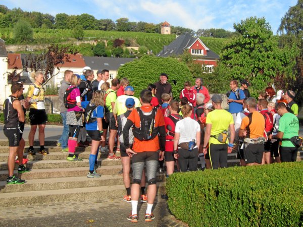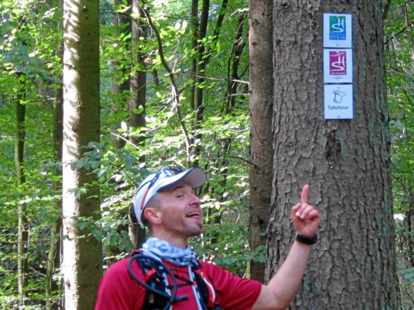 Wieder zurück am Europadenkmal ging es anschließend über den Fluss nach Perl, wo wir in den SH-Trail einstiegen und es gleich recht steil die Weinberge hoch ging. Noch ein letzter Blick hinunter auf Schengen und die Mosel und wir waren endgültig auf dem Trail. Übrigens - auf der Wendestrecke liefen wir auch kurz in Frankreich, so dass der Etappenlauf tatsächlich durch drei Länder führt!