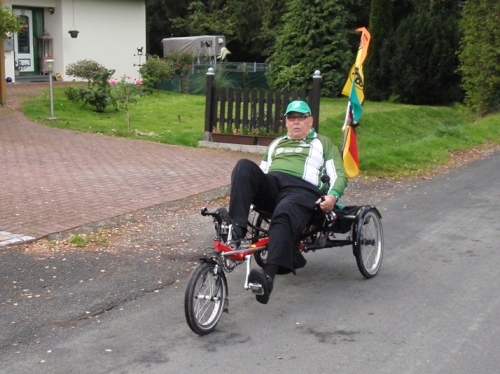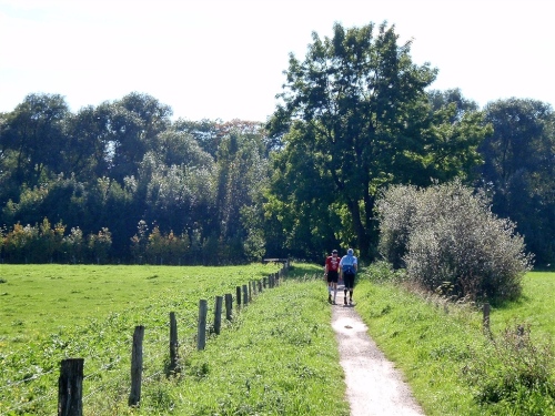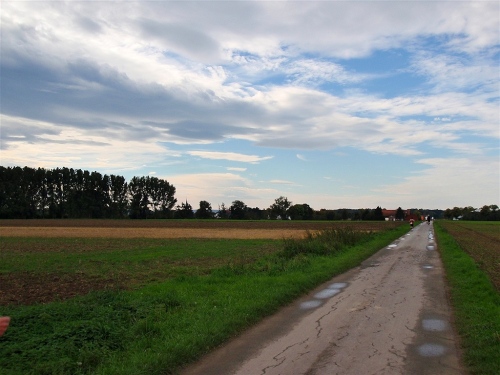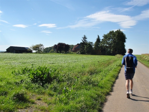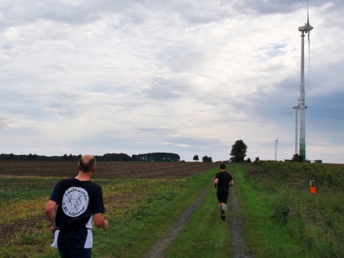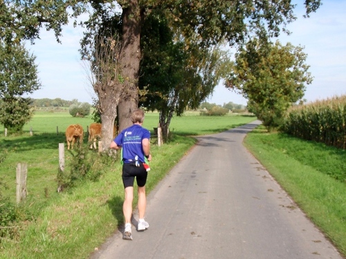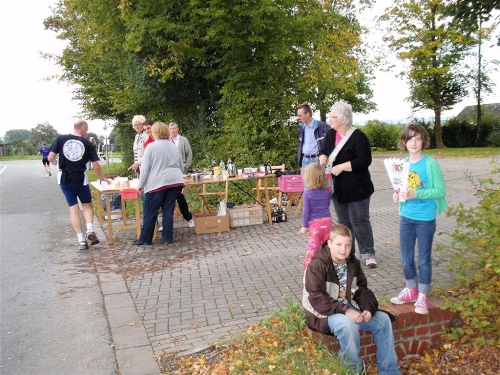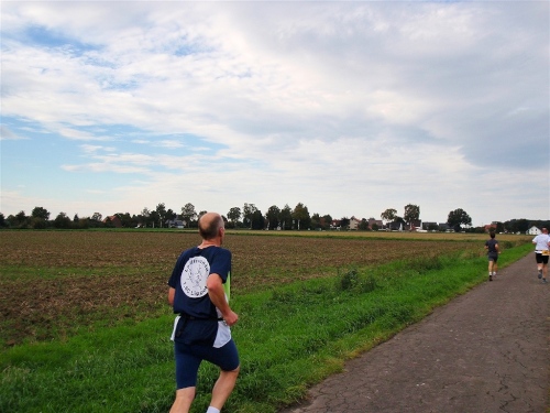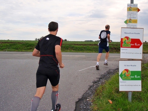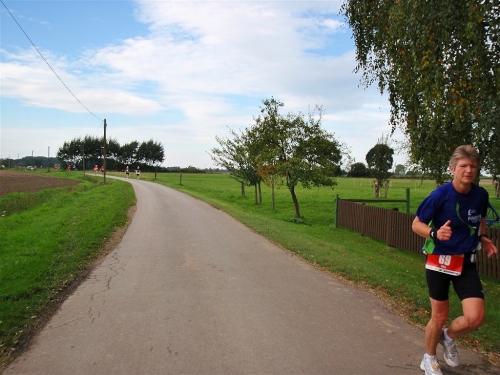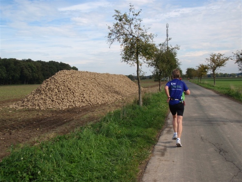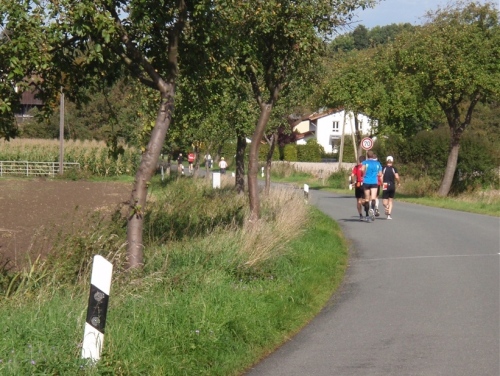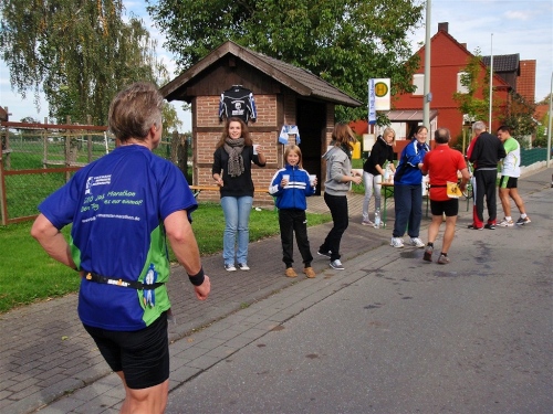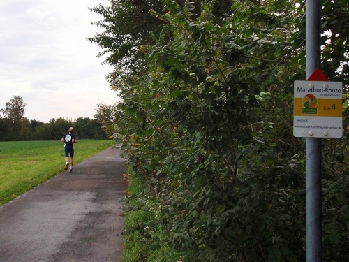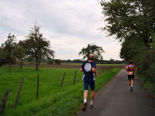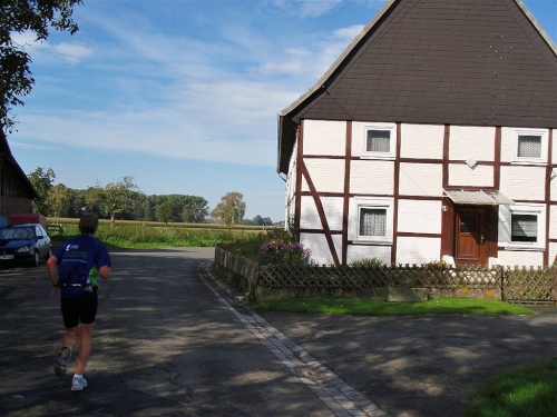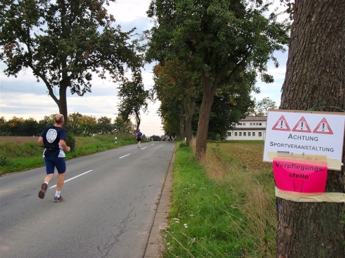 Wir folgen weiter der ersten fix ausgeschilderten Marathon-Route in Deutschland. Wer hätte gedacht, dass diese bisher einzigartige Einrichtung ausgerechnet in dieser ländlichen Gegend zu finden ist. In Flerke begegnet mir kurz darauf ein „Dreirad-Fahrer“. Er hat sich heute auch begeistert auf die Straßen von Welver begeben, ganz unter dem Motto aller Teilnehmer: Der Weg ist das Ziel. Kurz darauf laufe ich zu Silvia auf, und nutze die Gelegenheit die folgenden Kilometer nicht alleine zurück zu legen. Ein kurzer Gedankenaustausch klärt unsere übereinstimmenden Tempovorstellungen. So vergehen die folgenden Kilometer wie im Flug und Klotingen, Einecke, Eineckerholsen und Schefe liegen rasch hinter uns. Endlich kommt jetzt auch, wie versprochen, die Sonne hinter den Wolken hervor. Die Apfelbäume, die zahlreich die Strecke säumen, kommen so jetzt erst richtig zur Geltung. Wenn es nicht einfacher wäre, die an den Verpflegungsstellen angebotenen mundgerecht zubereiteten Apfelspalten zu erhaschen, wäre ein Pflücken die verführerische Alternative. Die Temperaturen sind noch erträglich.