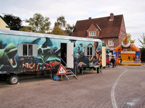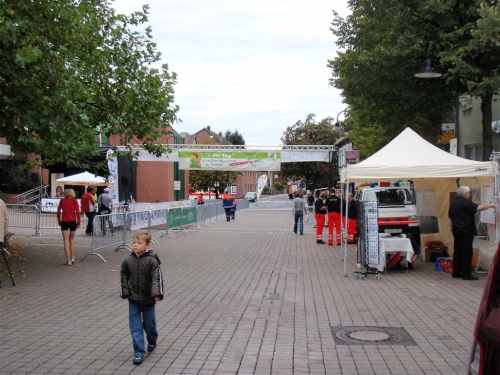 Bei meiner Ankunft in Welver sind tatsächlich schon die letzten Tropfen verschwunden und die im Internet angegebene Vorgabe für das Navi führt mich zudem nah an den Start- und Zielbereich heran. Von meinem schnell gefundenen Parkplatz ist es nur ein Katzensprung zur Startnummernausgabe. Um 9.00 Uhr geht es hier noch gemächlich zu. Meine Startnummer bekomme ich deshalb zügig und habe ausreichend Zeit mich zu den nahe gelegenen Umkleiden in der neuen Doppelturnhalle zu begeben. Ein Verlaufen ist ausgeschlossen. Eine weiße Linie führt mich die 400 Meter über den Marathon-Markt zielsicher dorthin. Dieser wird im Laufe des Tages noch viele Besucher anlocken, denn das Spektrum der Angebote reicht von Gaumenfreuden über geistige Nahrung und Gewinnspielen bis zu Bewegungsangeboten für die Kleinsten in Form einer Hüpfburg.