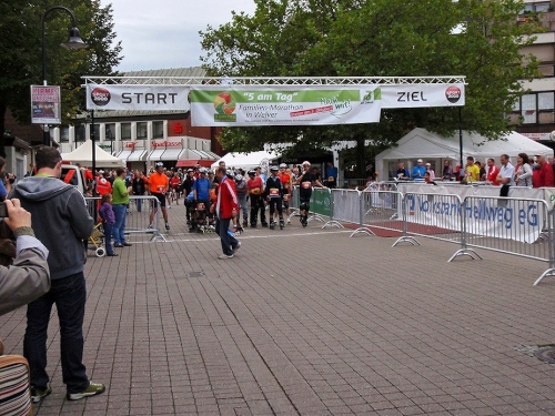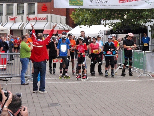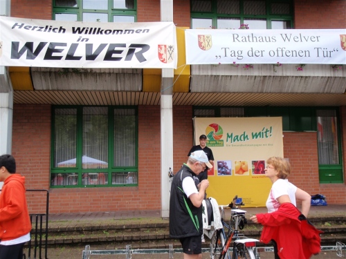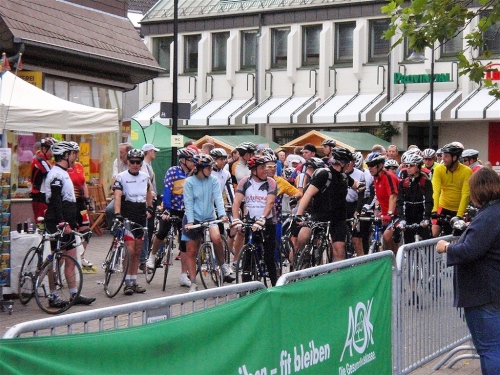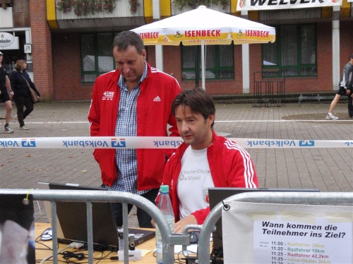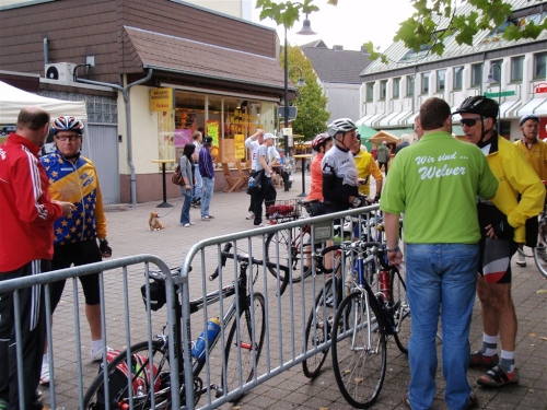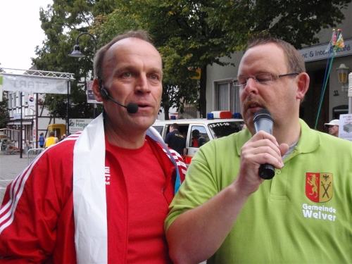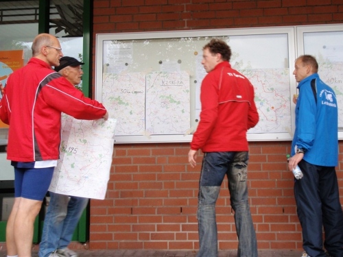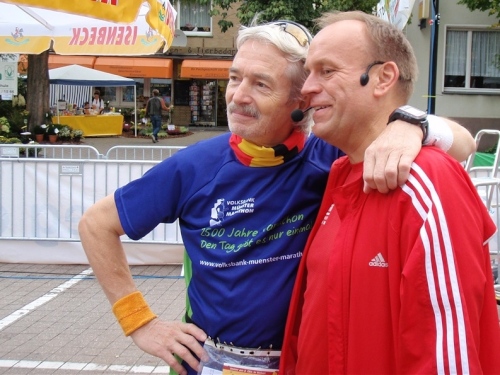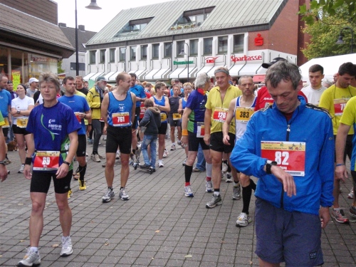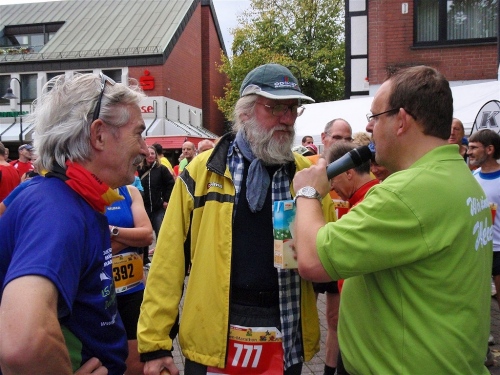 Zurück auf dem Rathausvorplatz ist es merklich voller geworden. Die Teilnehmer stehen jetzt für ihre Startnummern Schlange. Dass die Veranstaltung auch Viel-Läufer anzieht merke ich, als ich HaWe und Günter kennen lerne. Beide sind wie ich regelmäßige Münster-Marathon-Teilnehmer. HaWe teilt mit mir sogar das Vergnügen, alle Läufe dort bestritten zu haben. Günter musste wegen des Transalpinlaufes in diesem Jahr leider passen. Dieser Lauf über die Alpen in 8 Etappen mit einigen Tausend Höhenmetern übersteigt allerdings noch meine Vorstellungskraft.