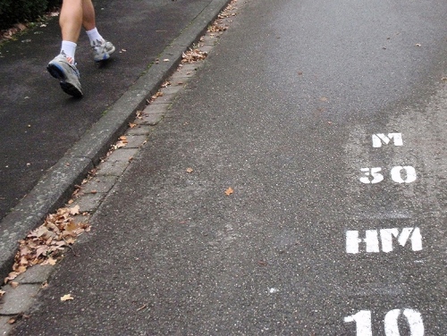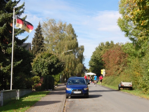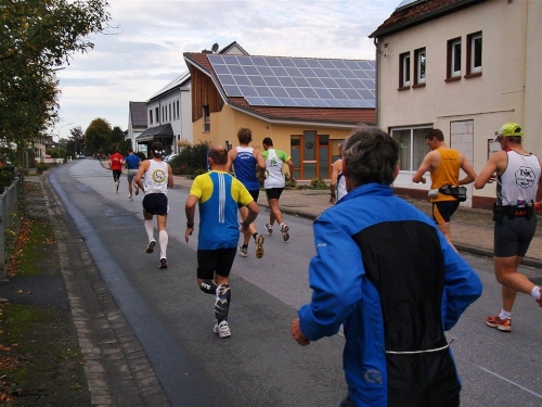 Ich muss aufpassen, dass ich mich nicht zu sehr von meiner euphorischen Stimmung zu einem zu flotten Tempo verführen lasse. Die ersten Kilometer gehen schließlich wieder leicht von der Hand. Nur Zuschauer sind noch selten. Dafür feuern die Wenigen die Läufer bei KM 8 bereits zum 2. Mal an. Hier liegen die Dörfer Illingen und Scheidingen bereits hinter uns.