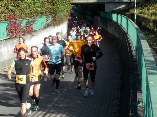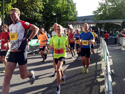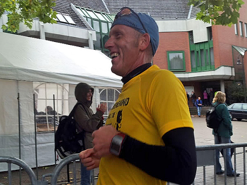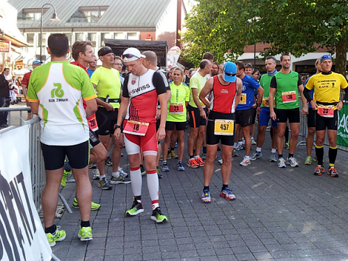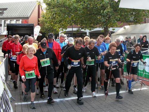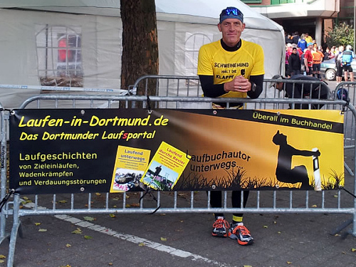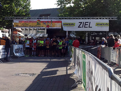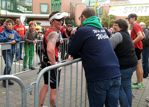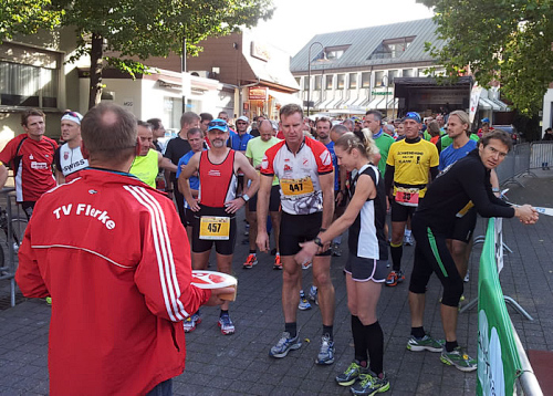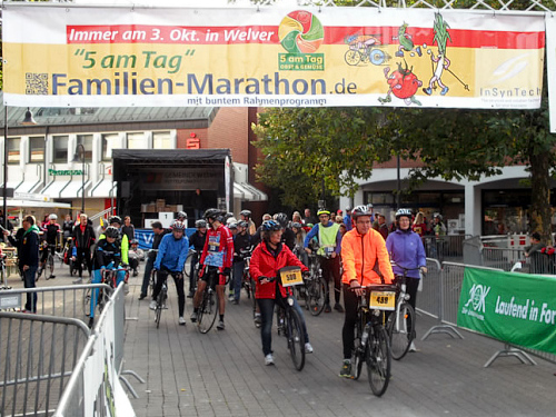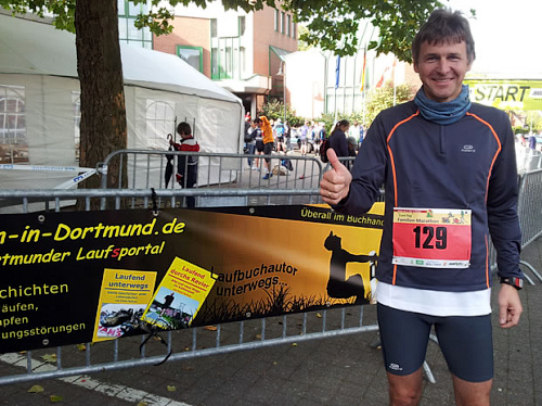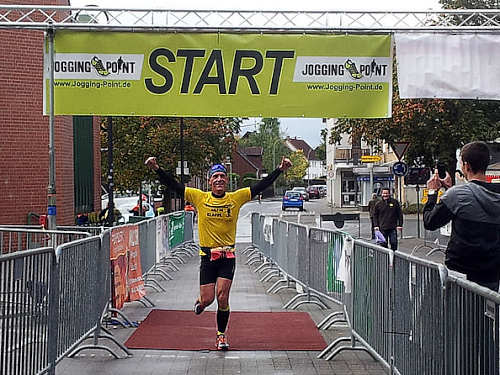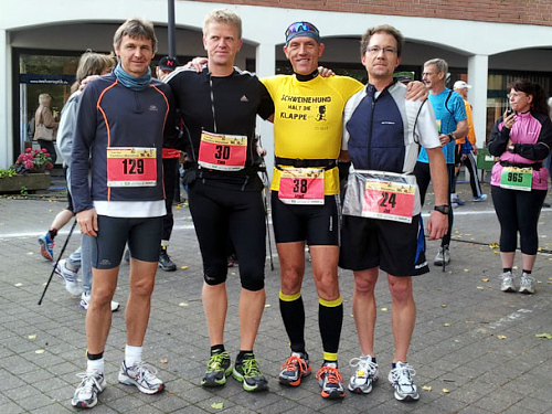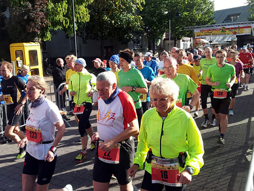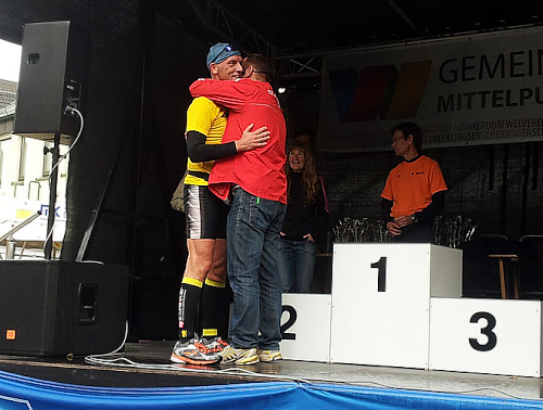 Als wir am 3. Oktober dann schließlich auf dem Welveraner Marktplatz am Start stehen, merke ich sofort, dass der Veranstalter Wind von meinem Jubiläum bekommen hat (was natürlich auch daran liegen kann, dass ich ihn vorher ausführlich darüber informiert habe ;-)). Der Moderator interviewt mich im Startfeld und spricht mich auf das Jubiläum an. Ich erzähle von meinem heutigen Jubiläum und erwähne dabei, dass in unserem Kofferraum ein paar Flaschen Sekt auf meinen Zieleinlauf warten.