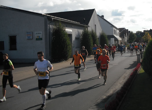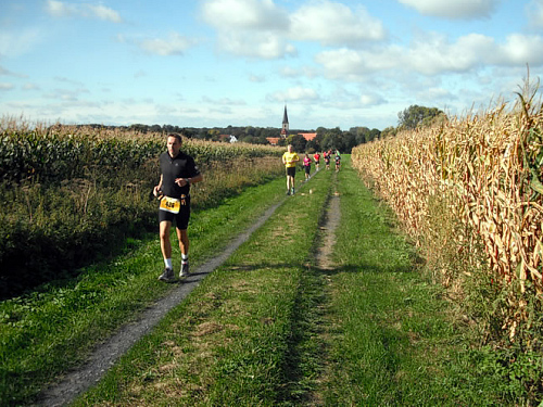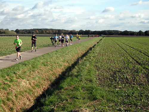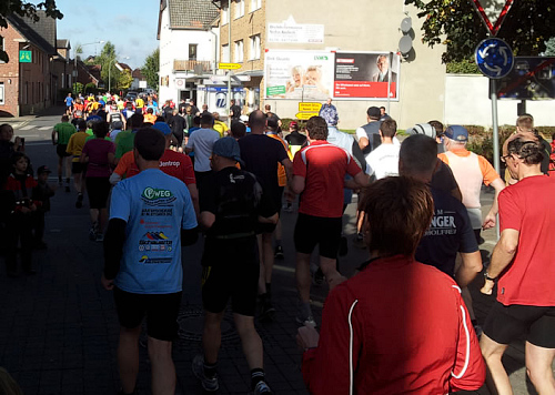 Dann geht es mit ein paar Minuten Verspätung auf die Strecke. Das Wetter ist zum Laufen klasse, nur der starke Wind wird uns gleich zu schaffen machen. Aber noch laufen wir den ersten Kilometer durch Welver und merken noch nicht viel davon.