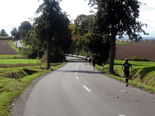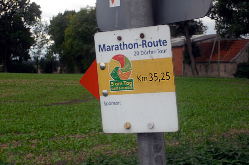 An zwei Stellen auf der Marathonrunde finde ich eine ganz neue Art eines Verpflegungsstandes. Dort steht dann ein Tisch, auf dem jede Menge Sixpacks mit Halb-Liter-Flaschen Mineralwasser auf uns warten. Ganz ohne Personal. Man nimmt sich eine Flasche mit, trinkt so viel man will und wirft sie dann an den Rand. Ganz einfach. So sind die Stellen überbrückt, an denen die Abstände zwischen den Ortschaften zu groß sind. Eine einfache und tolle Idee.