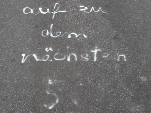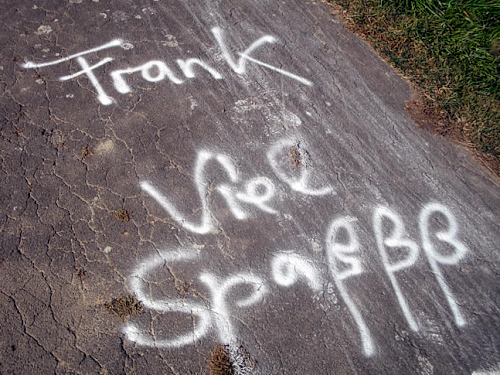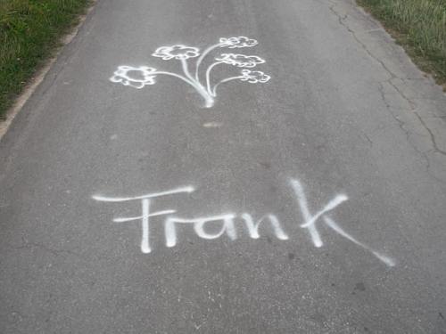 Ab und zu finde ich auf meiner Runde Hinweise, die in Weiß auf die Straße gesprüht sind. „Frank, viel Spaß!“ oder meinen Namen mit einem Blumenstrauß. Zuerst denke ich, dass da ein Angehöriger irgendeines Franks Motivationsgrüße auf der Straße hinterlassen hat. Schließlich lese ich irgendwann „Auf zu den nächsten 50“ und ab da weiß ich, dass die Straßensprüche mir gelten. Klasse. Darüber freue ich mich sehr.