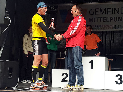 Mit den vielen Freunden und Bekannten stehen wir jetzt noch lange zusammen und genießen den mitgebrachten Sekt. Eine richtig schöne Jubiläumsfeier. Und dann muss ich schließlich noch auf die Bühne und bekomme von Helmut, dem Veranstalter, einen schönen Jubiläumspokal zu meinem goldenen Marathon. Mein erster Pokal überhaupt. Und spätestens jetzt bin ich mir ganz sicher, dass es die richtige Entscheidung war, meinen 50. Marathon hier zuhause in Welver zu laufen.