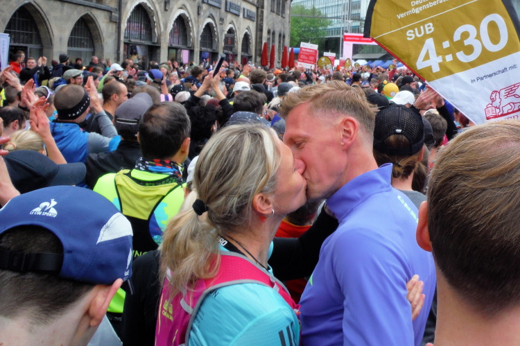 KM 40 ist erreicht. Am Schlossteich warten meine Freunde mit den Kuhglocken. Die letzten zwei Kilometer lasse ich die Pacemaker ziehen und genieße die Eindrücke und Atmosphäre. Artig verabschiede ich mich vom Nischl, bewundere noch einmal die die Stadthalle mit dem Charme der 60er Jahre des 20. Jahrhunderts und lasse mich dann von der Begeisterung der Zuschauer ins Ziel tragen, wo mein Heart of gold, Silke, bereits auf mich wartet.