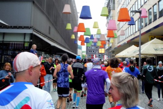 Wir machen uns weiter auf den Weg zur Stadthalle, in der ab 10 Uhr die Startnummern ausgegeben werden. Eine lange Warteschlange zeugt vom großen Interesse an dieser Laufveranstaltung. Über 8.000 Teilnehmer sind gemeldet. 1.045 davon werden sich schließlich in der Marathon-Finisherliste wieder finden. Alle Übrigen sind als Staffel oder über den Halb- bzw. Viertelmarathon auf der Strecke.