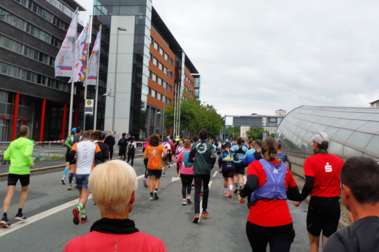 Das Marathonfeld ist jetzt so weit auseinander gezogen, dass ich die Strecke fasst für mich habe. Dann muss beim liegenden Eiffelturm auch noch Herbert abreißen lassen. Abwechslung bieten immerhin etliche Zuschauer, die engagierten Helfer und die Musikgruppen, die wie die Läufer Ausdauer zeigen. Auch wenn ich jetzt langsamer werde, komme ich gut voran. Im Stadtpark auf derselben Strecke wie einst Waldemar Cierpinski unterwegs zu sein, motiviert.