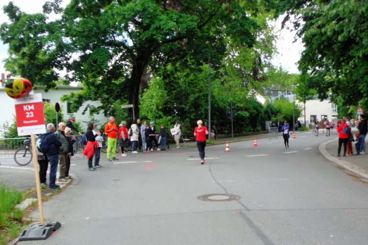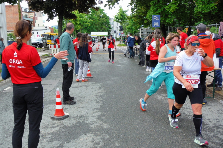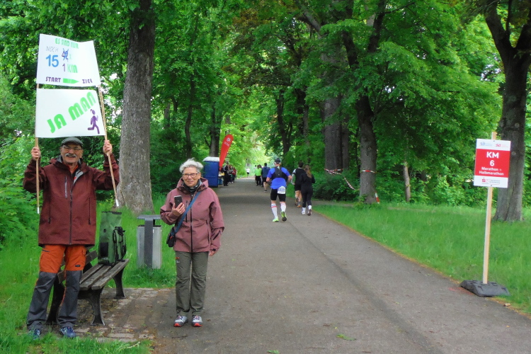 Am Verpflegungspunkt bei KM 6 wird neben Wasser auch Cola gereicht, auch Bananen sind im Angebot. Frisch gestärkt geht’s weiter. Fahnenschwenker zeigen ihre Kunst. Kurz darauf treffen wir auf der Beckerstraße ein zweites Mal auf ein kurzes Begegnungsstück. Noch sind wir also schnell genug unterwegs. erst kurz hinter KM 9 überholen uns die Pacemaker für eine Zielzeit 4:45 Stunden. Wir lassen sie ziehen.