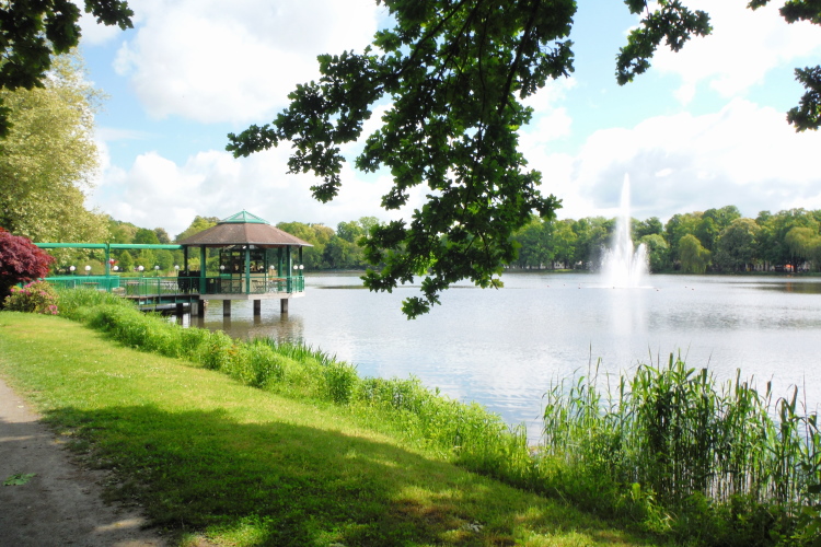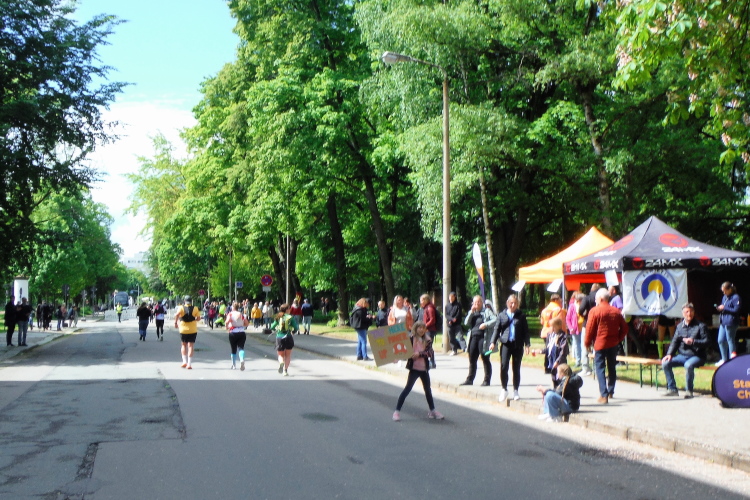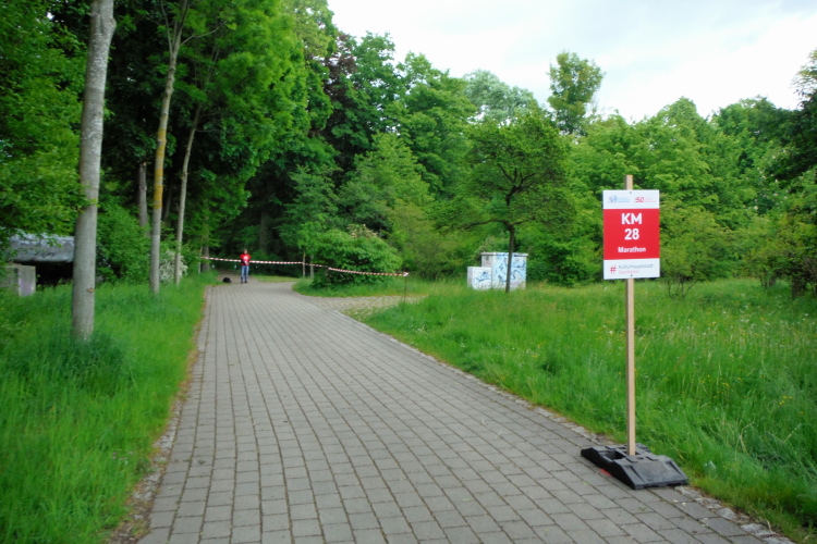 Auf den nächsten Kilometern durch den Stadtpark bieten zahlreiche Bäume Schutz vor Wind und spenden Schatten. Etwas, was ich heute noch schätzen werde, denn das Wetter spottet der Prognose. Vom vorhergesagten Regen fallen lediglich am Ende der Veranstaltung Tropfen. Dafür strahlt die Sonne meist umso mehr.