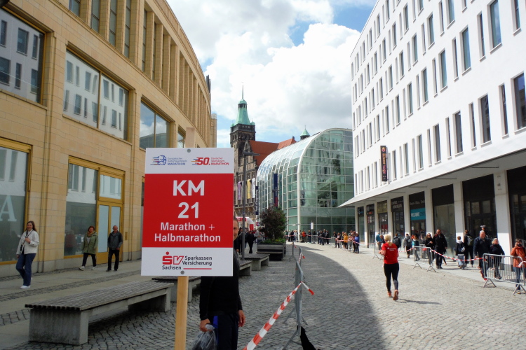 Links geht es um das alte Rathaus und die St. Jacobi-Kirche herum. Die romanischen Ursprünge des Sakralbaues reichen bis ins 12. Jahrhundert zurück. Mit diesem schönen Anblick beginnt die nördliche Schleife der Marathonstrecke. Diese wird noch mehr architektonische Leckerbissen bereithalten. Der nächste wird bereits bei KM 11 geboten: die alte Markthalle. Erbaut 1890, erinnert sie an die Zeit, als Chemnitz eine prosperierende Industriestadt war und auch das Manchester Sachsens genannt wurde. Genutzt wird das Gebäude jetzt für Gastronomie und Kultur. Derzeit beherbergt sie eine Ausstellung des bekannten Fassadenkünstlers Banksy.