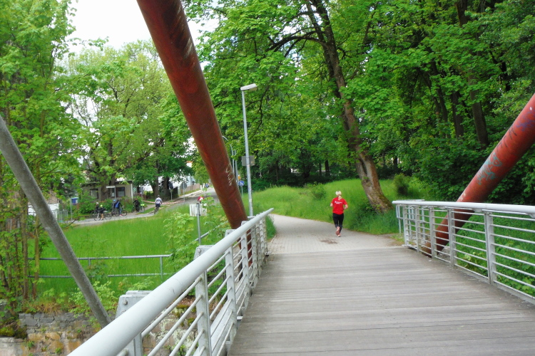 Gut gestärkt sind wir wieder am Fluss angekommen, dem wir zurück nach Süden folgen. Erst begeistert noch die Industriearchitektur, dann die „Draufgänger Guggis“ mit ihren schrägen Klängen ein. Der Schlossteich wird erneut bei KM 19 erreicht. Bevor ich nach links abbiege, bewundere ich die Mitstreiter, die jetzt geradeaus erst den Schlossberg erklimmen. Ich bin froh, diesen hinter mir zu haben und erfreue mich an dem vielen Grün der Stadt. Bevor wir den Schlossteich endgültig verlassen, heizen uns die intensiven Beats von „Kukaye Moto“ ein.