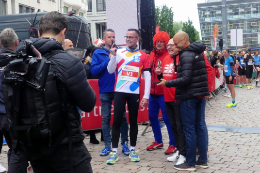 Vom Hotel kommen problemlos mit öffentlichen Verkehrsmitteln zum Rathaus. Die letzten Teilnehmer bekommen noch ihre Startnummer. Vor dem Startbogen treffe ich Herbert aus Linz mit seiner Frau Evi. Nach Abgleich unserer Zielzeiten ordnen wir uns gemeinsam im hinteren Feld ein. Der Startbereich füllt sich jetzt schnell und es wird eng vor dem Rathaus. Vorne wird Waldemar Cierpinski interviewt und zum derzeitigen Laufboom in Deutschland befragt.