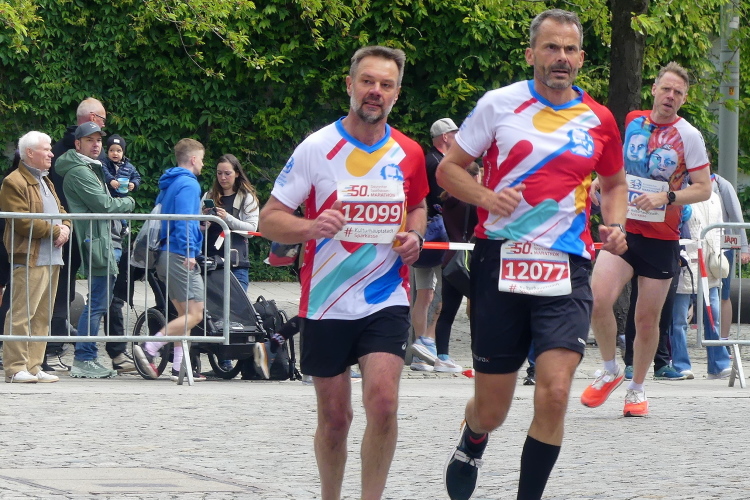 35 Kilometer liegen hinter mir, als mich die ersten Halbmarathons ein. Schnell werden es immer mehr und bald ist auf der Strecke richtig was los. Notger und Sven sind als Tempoläufer für 5 Stunden unterwegs, im Schlepp Debütantin Runa. Sind sie zu schnell, oder bin ich zu langsam? Wir einigen uns, gut in der Zeit zu liegen. Wir tauschen uns über diverse Marathonläufe aus und sind uns einig, dass der heutige Lauf eine echte Empfehlung ist. Vielleicht beginnt ja eine neue Serie.