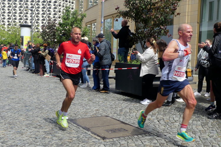 Bei KM 29,5 kommen mir auf einem kurzen Begegnungsstück die Halbmarathonläufer entgegen. Die Schnellsten von ihnen werden mich bald einholen. Kurz darauf wird erneut das alte Rathaus erreicht und ich befinde ich mich auf der Nordschleife. Markthalle und Hartmann-Fabrik, der Gitarrist am Schlossteich empfängt mich mit „Heart of gold“. Bevor ich den Schlossberg hinaufkraxle, bewundere ich den Barfußläufer, der den Zeitmesschip in der Hand trägt und den vielfältigen Straßenbelägen trotzt. Dann begleiten mich die Kuhglockenklänge den Berg hinauf. Abklatschen darf ich auch.