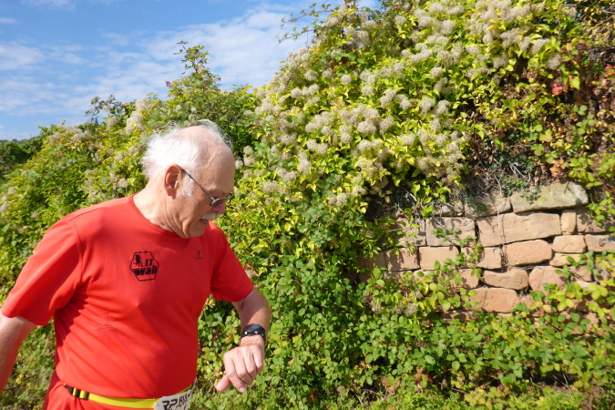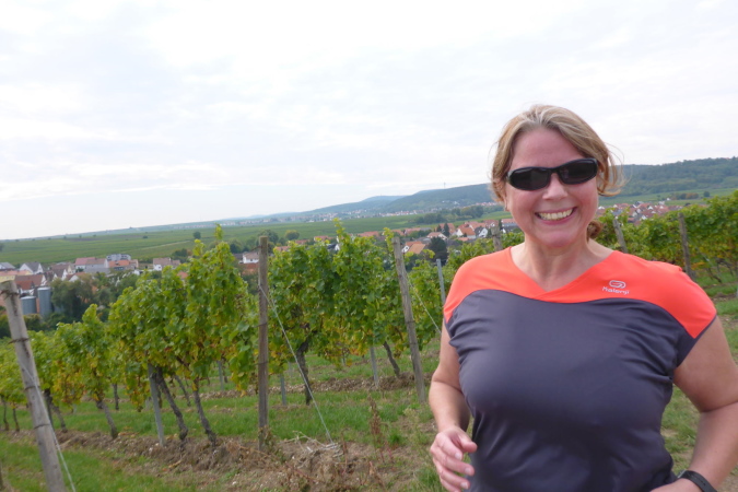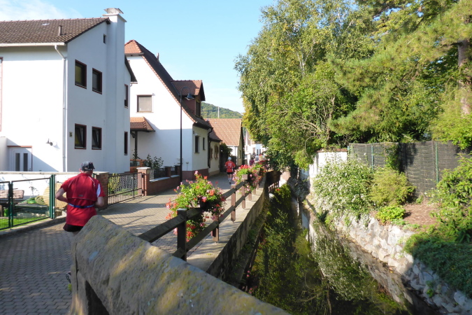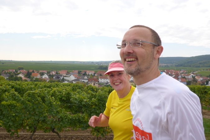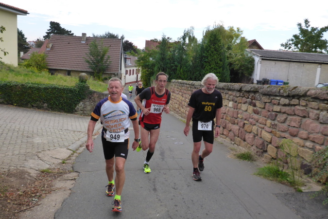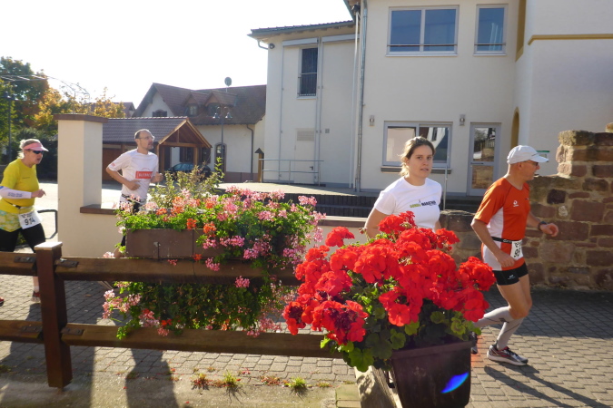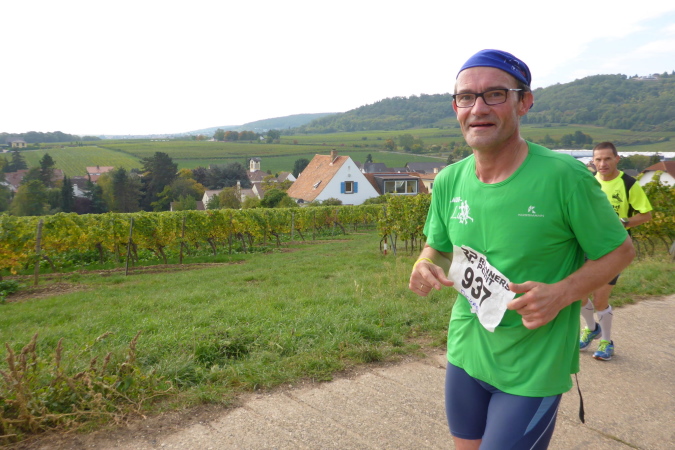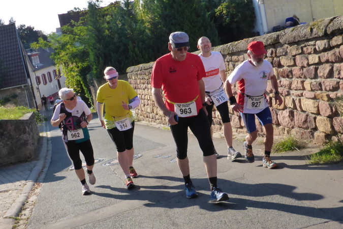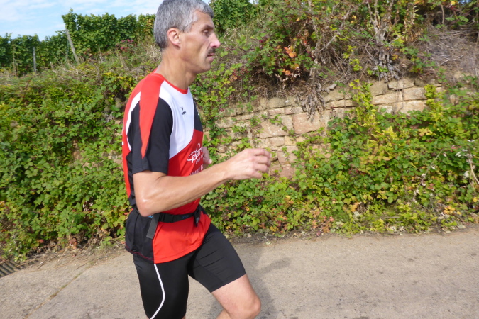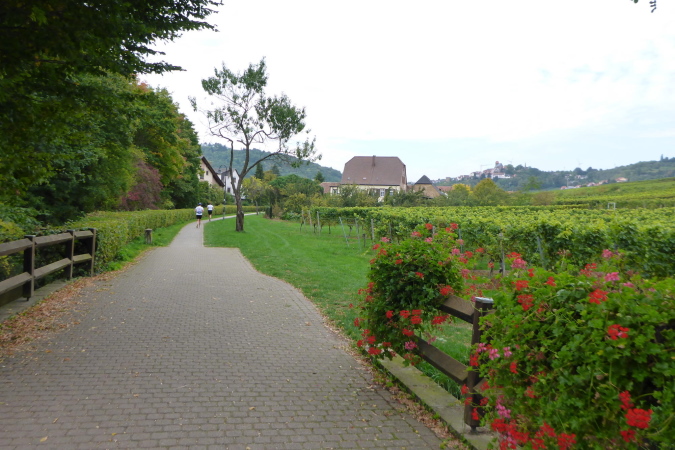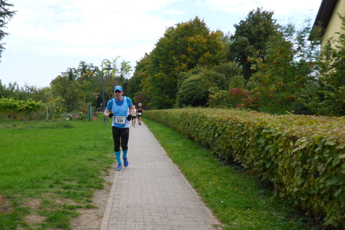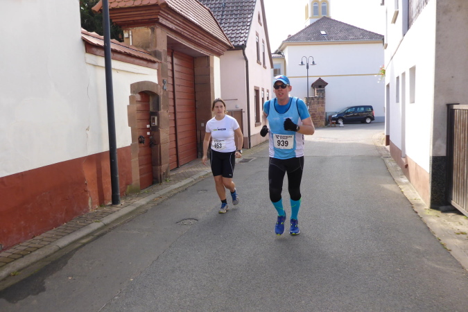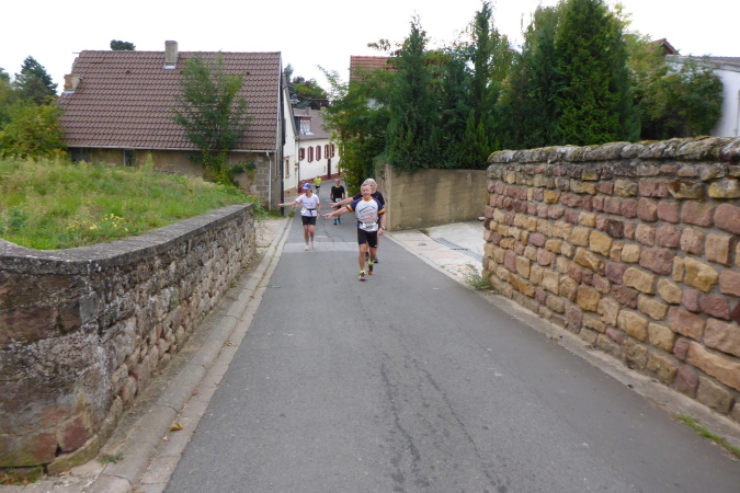 Gepflegte Fachwerkhäuser säumen die enge Straße. Jetzt führt der Weg spürbar bergauf. Außerhalb des alten Ortskerns wurden neue Häuser an den sonnigen Hang gebaut. Hier ist es schon ganz schön steil. Nochmal rechts und wir finden uns im Weinberg wieder. Eigentlich wollte ich in den ersten Runden die Steigung noch laufen, aber meine Beine sind bleischwer. Da hilft nur wandern. Hinter einer leichten Linkskurve geht es nochmal richtig zur Sache. Norbert ist mein Tempo zu langsam und er verabschiedet sich nach vorne. Oben angekommen, laufen wir an der Kreuzung rechts weiter (km 1).