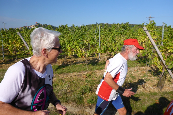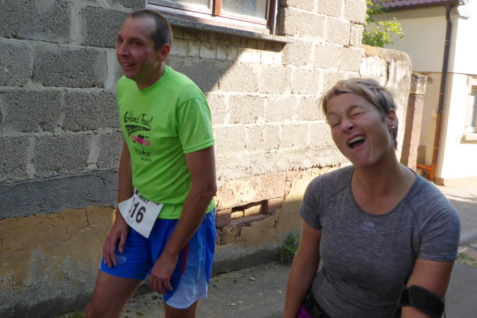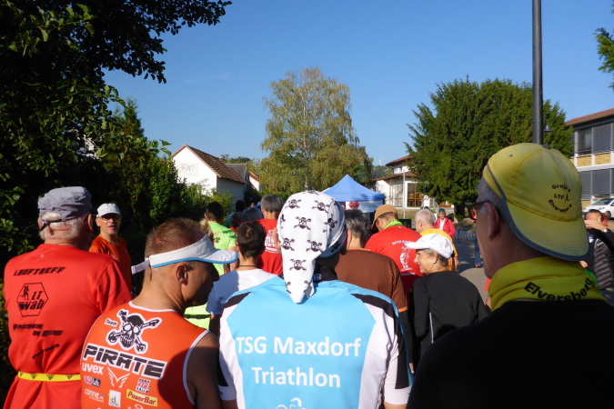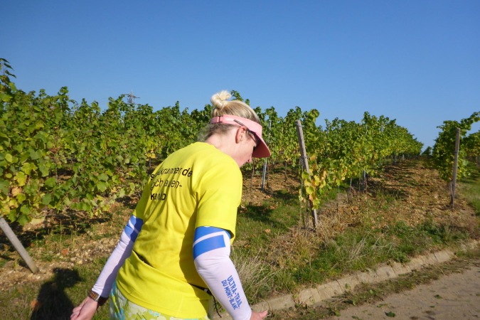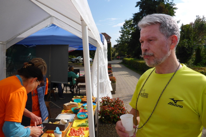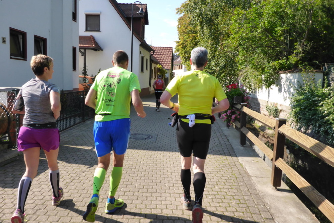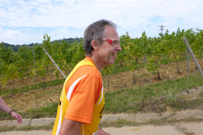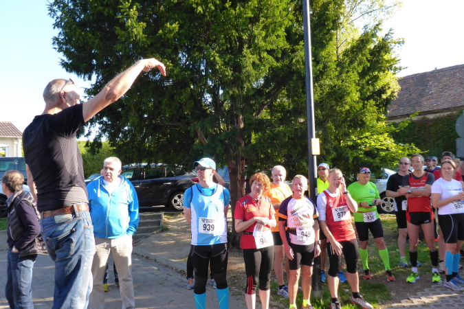 Wer wollte, konnte in der Sporthalle übernachten und wurde am Morgen zu einem üppigen Frühstück eingeladen. Gabi und Peter tun eben alles für ihre Läufer. Mit der Zeit verlagert sich das Leben nach draußen. Ohne Stress bereitet sich jeder vor. Um kurz vor 10 findet ein kurzes Briefing statt. Peter Gründling gibt noch schnell wichtige Hinweise, die vor allem von den Neulingen interessiert verfolgt werden: Keinen Müll auf der Strecke liegen lassen, sich nicht mit großen Traubenvollerntern anlegen und den roten Pfeilen folgen. Außerdem sind wohl wegen einer Straßensperrung im Nachbarort, trotz Fahrverbots, einige Autos auf der Strecke zu erwarten.