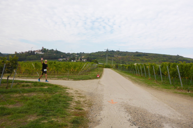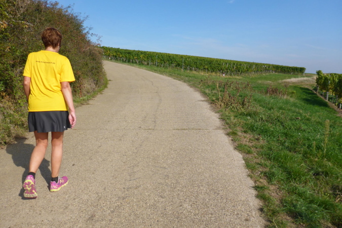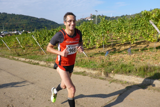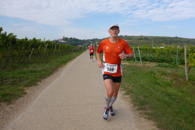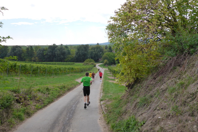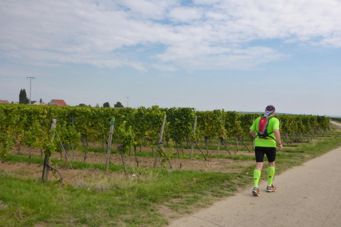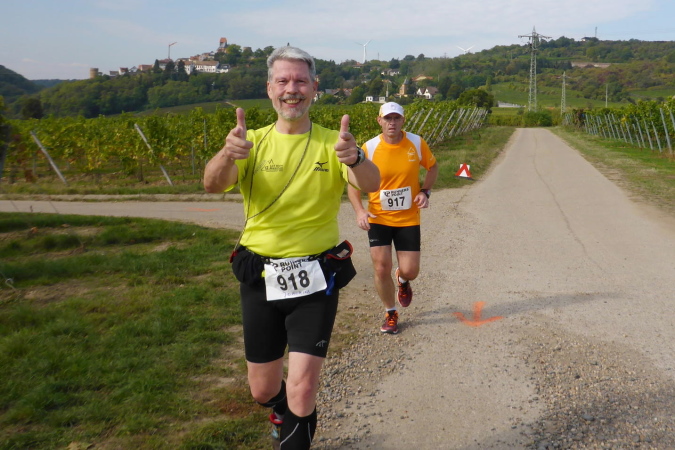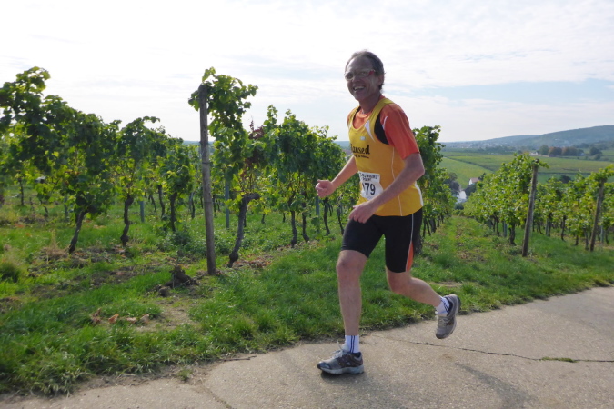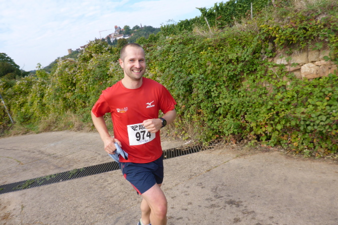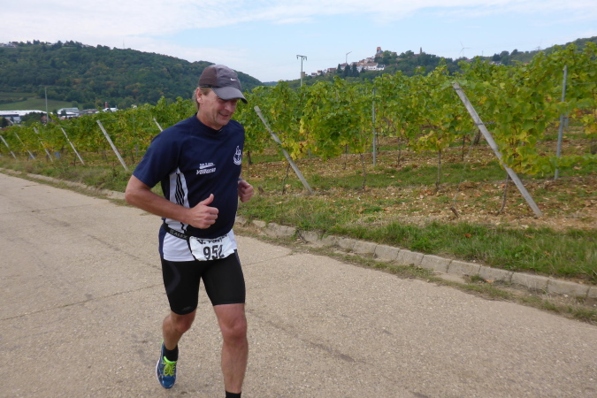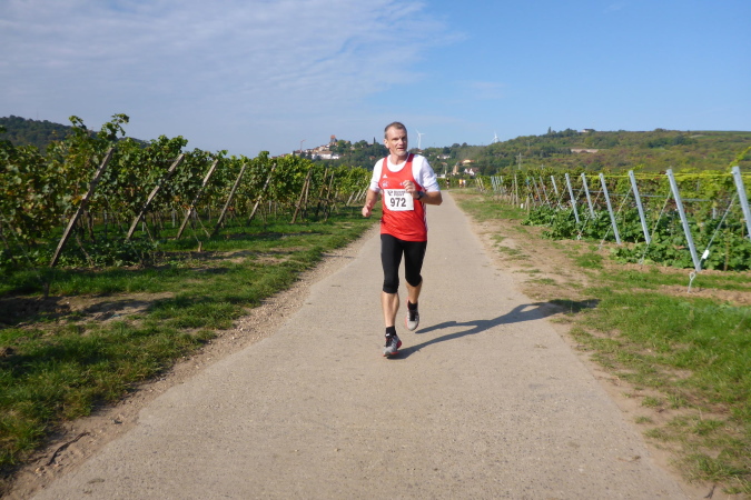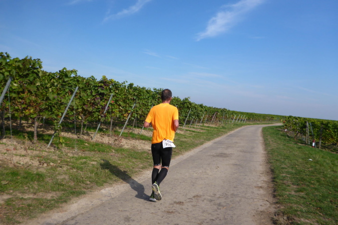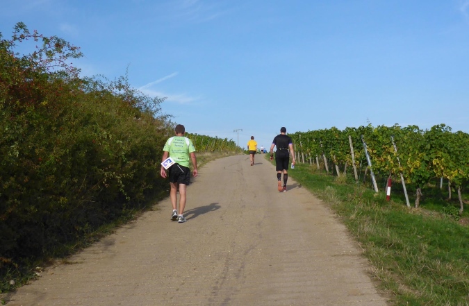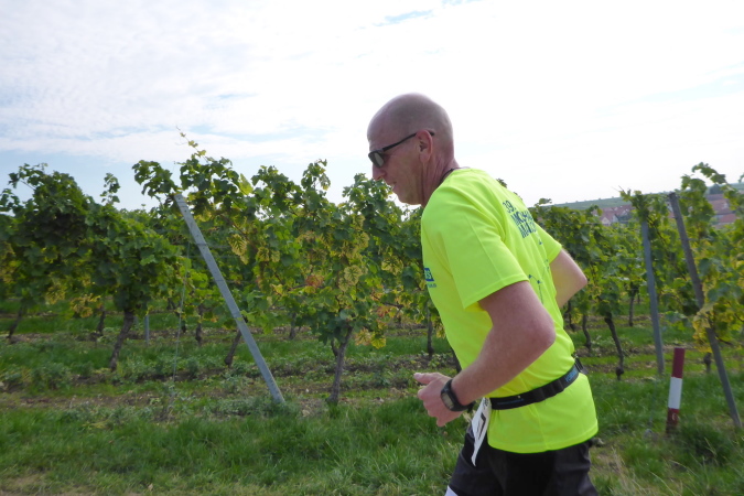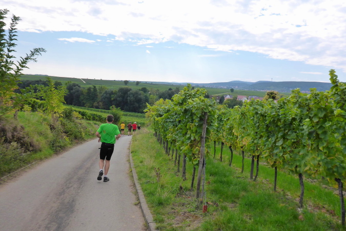 Am Ausgang der Verpflegung werde ich zum ersten Mal überrundet. Matthias Klug hat bereits einen großen Vorsprung herausgelaufen. Erst an der Steigung kommen die nächsten schnellen Läufer von hinten. Langsam bin ich eingelaufen und es geht nicht mehr so zäh, wie am Anfang. Wie die meisten meiner Mitstreiter marschiere ich die steilen Abschnitte hinauf und lasse es bergab rollen. Ansonsten bleibt viel Zeit, um sich mit anderen auszutauschen. Das macht den Lauf kurzweilig. Das Wetter ist optimal. Immer wieder verhindern Wolkenfelder, dass es im Weinberg zu warm wird.