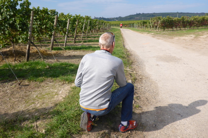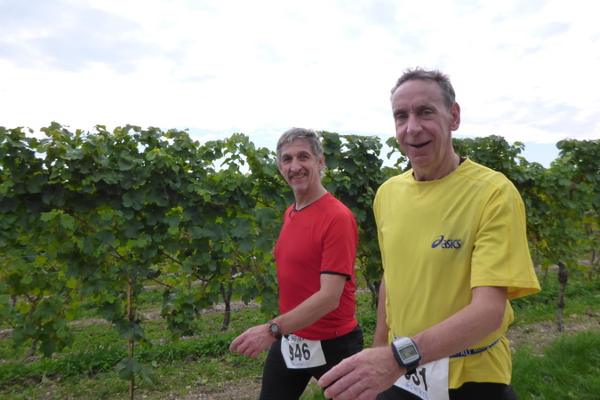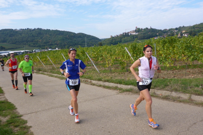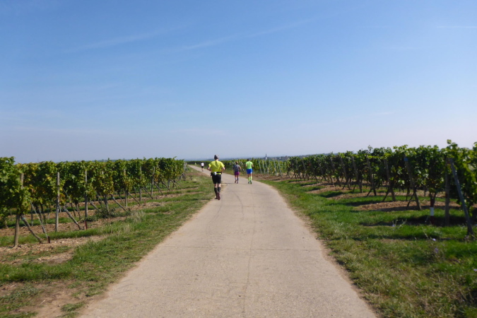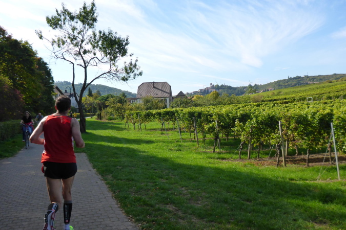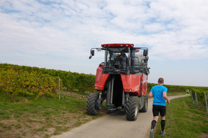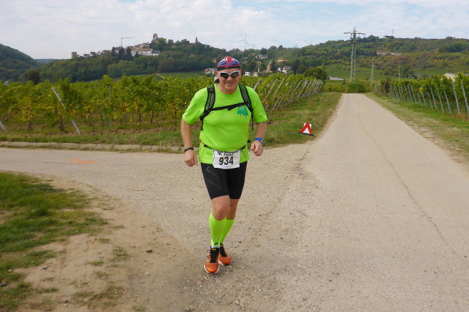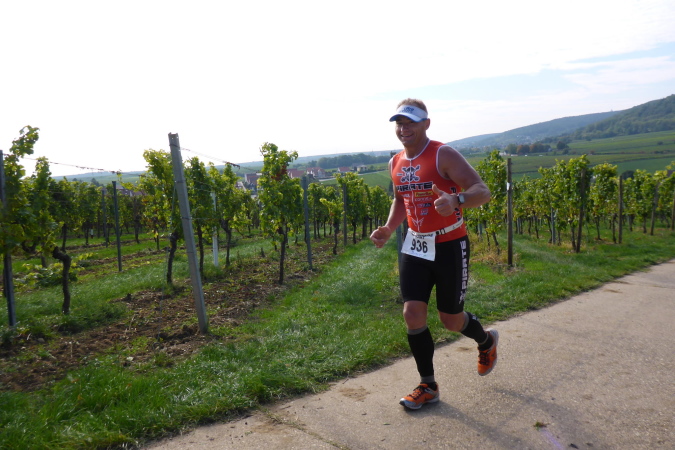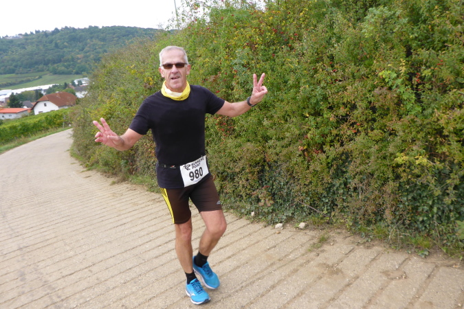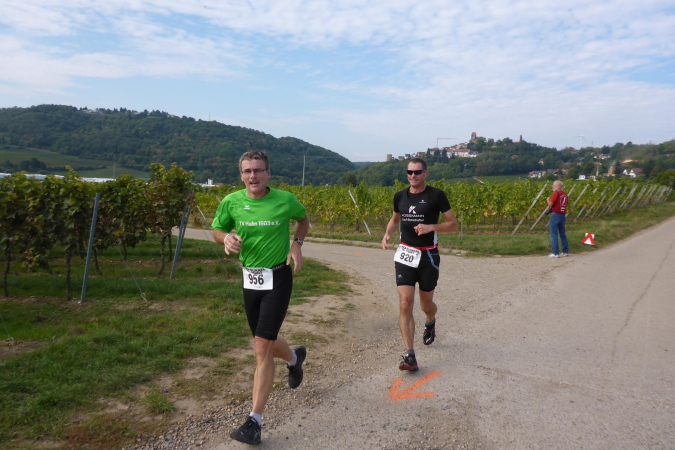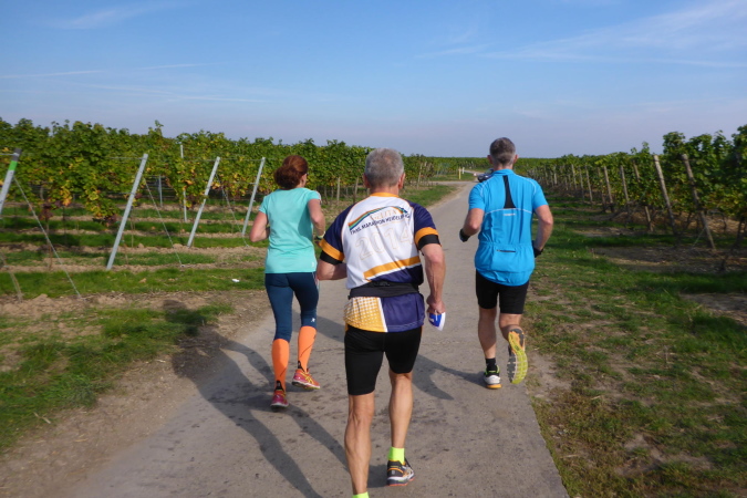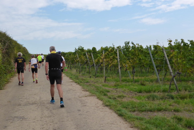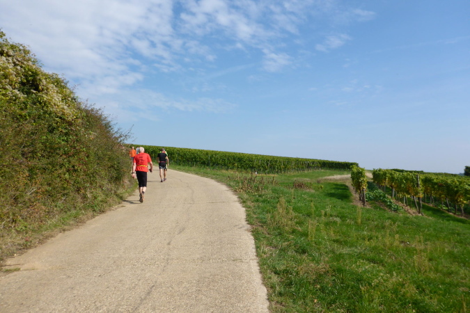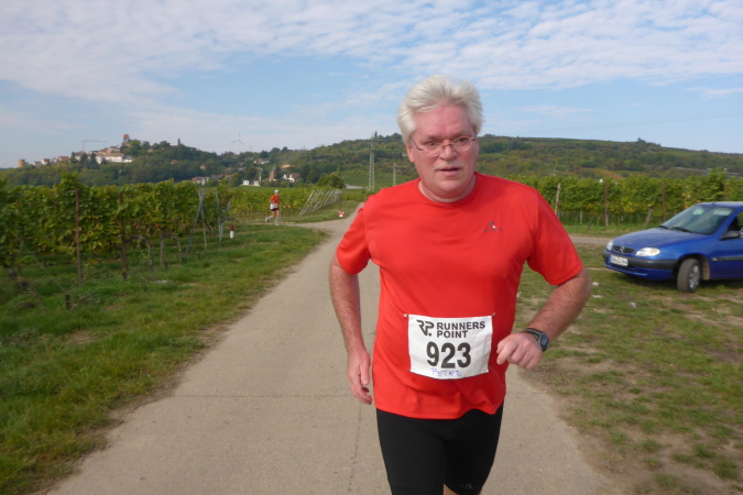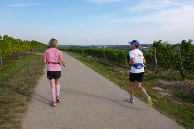 Am Ausgang der Verpflegung werde ich zum ersten Mal überrundet. Matthias Klug hat bereits einen großen Vorsprung herausgelaufen. Erst an der Steigung kommen die nächsten schnellen Läufer von hinten. Langsam bin ich eingelaufen und es geht nicht mehr so zäh, wie am Anfang. Wie die meisten meiner Mitstreiter marschiere ich die steilen Abschnitte hinauf und lasse es bergab rollen. Ansonsten bleibt viel Zeit, um sich mit anderen auszutauschen. Das macht den Lauf kurzweilig. Das Wetter ist optimal. Immer wieder verhindern Wolkenfelder, dass es im Weinberg zu warm wird.