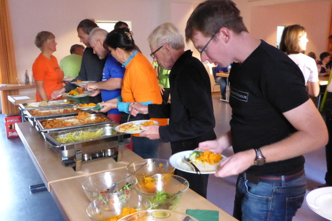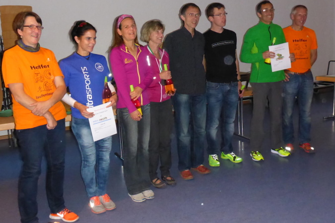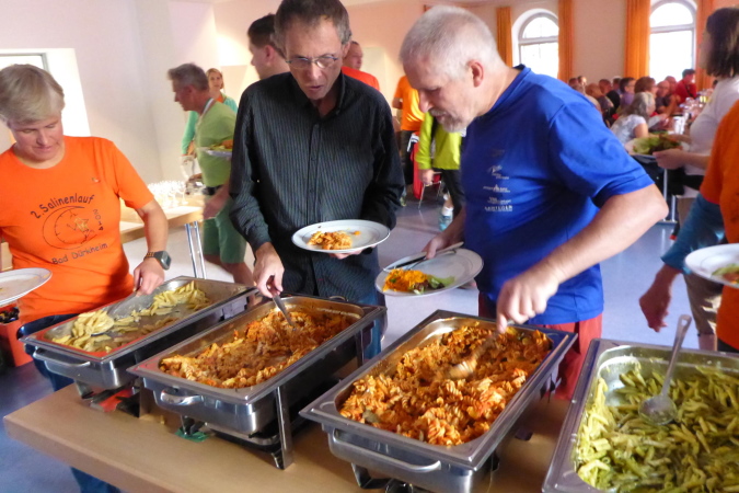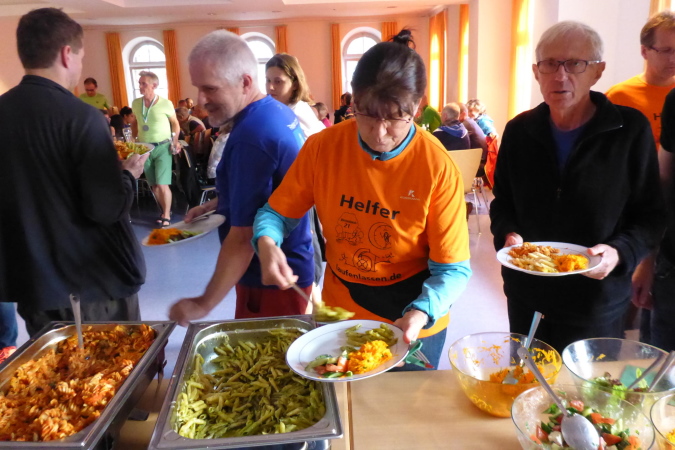 Im Gemeindehaus ist das Essen bereits angerichtet. Nach der Anstrengung sind alle hungrig und weil es sowieso im Startgeld inbegriffen ist, folgen alle der Einladung. Es gibt vier verschiedene Nudelgerichte, dazu Salat. Als alle satt sind, erwarten wir gespannt die Siegerehrung. Zuerst bekommt aber eine Läuferin ihre Urkunde für den 100. gefinishten Marathon. In solch einer schönen Runde geehrt zu werden, macht ihr sichtlich Freude. Anschließend wird allen Helfern gedankt.