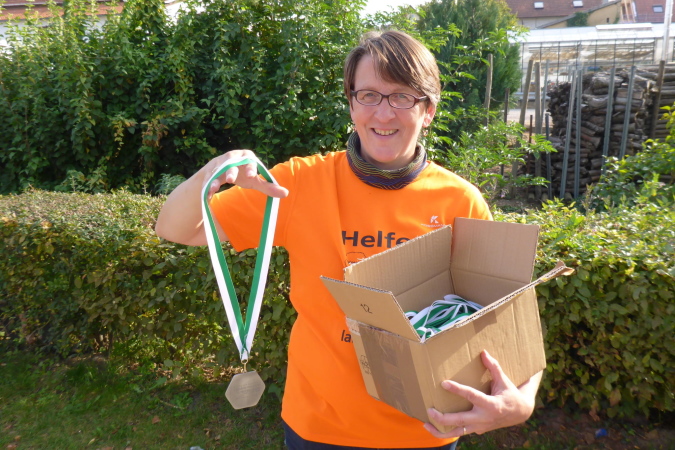 In diesem Jahr feiert Deutschland am 3. Oktober den 25. Jahrestag der Wiedervereinigung und in Kleinkarlbach findet der 6h-Lauf zum 6. Mal statt. In dem knapp 1000 Seelen-Ort ist von Feierlaune allerdings nichts zu spüren. Hier geht es am frühen Morgen beschaulich zu. Das Zelt für die Verpflegung und die Zeitnahme ist bereits aufgebaut, Parkplätze sind an der Grundschule genügend vorhanden. Als wir ankommen, ist der kleine Vorraum zur Turnhalle brechend voll. Wie bei einer großen Familienfeier haben sich Freunde und Bekannte eingefunden. Auch wer sich nur aus dem Netz kennt, kann sich endlich „in echt“ begrüßen. Wie ein Fels in der Brandung verteilt Gabi nach herzlicher Begrüßung die Startnummern. Jede wurde von Hand mit dem Namen des Läufers versehen. Zusätzlich bekommt jeder noch ein Los für die Tombola nach der Siegerehrung.